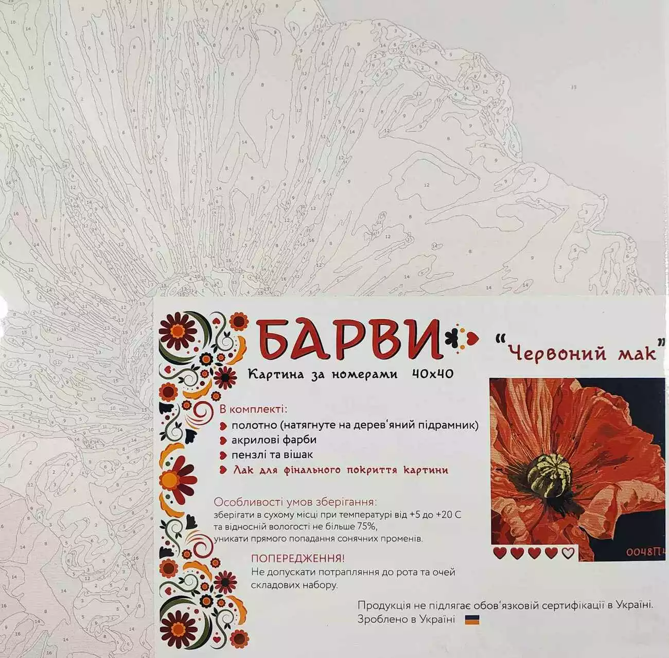 Відчуй себе справжнім художником! Використовуй розпис по номерам і твори шедеври! Дана картина добре прикрасить будь-який інтер'єр і подарує кожному твоєму гостю відчуття перебування вдома у справжнього генія! Увага! Кольори і чіткість картини можуть відрізнятися. Комплектація Набору для малювання: - натягнутий на дерев'яну рамку прогрунтоване полотно, з нанесеними і пронумерованими контурами квітів малюнка. Полотно і весь набір запаяний в стрейч плівку; - настінні кріплення 2 шт. і саморізи; - пронумеровані акрилові фарби в щільно закритих контейнерах (від 14 до 36 кольорів); - кисті (від 3 до 4 шт).