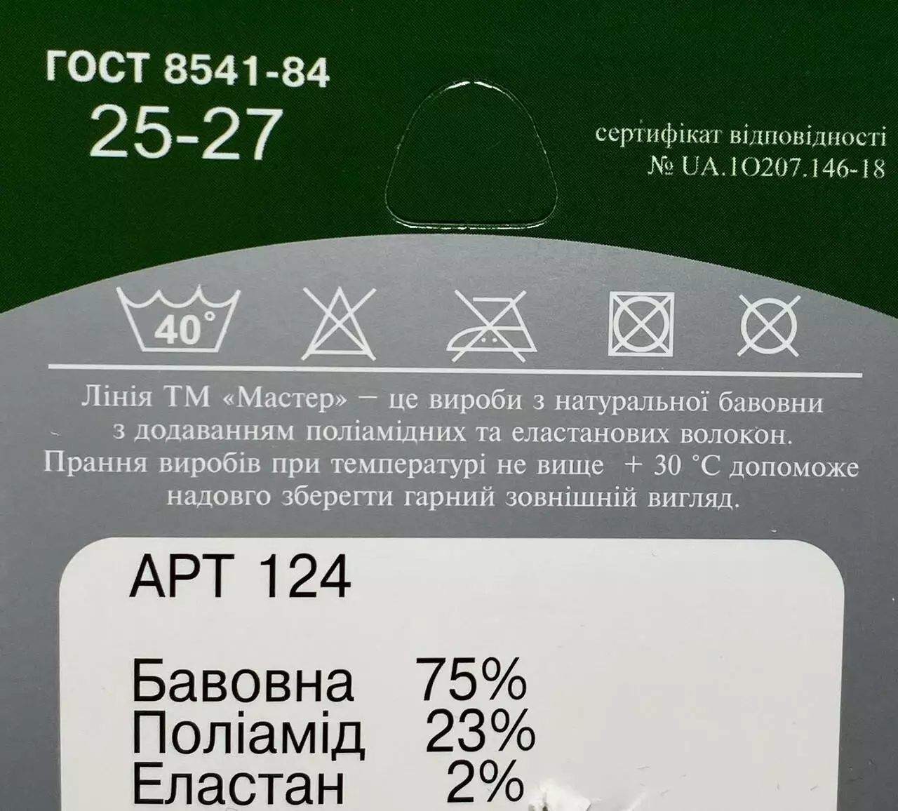 Склад: Бавовна — 75%; поліамід — 23%; еластан — 2%.