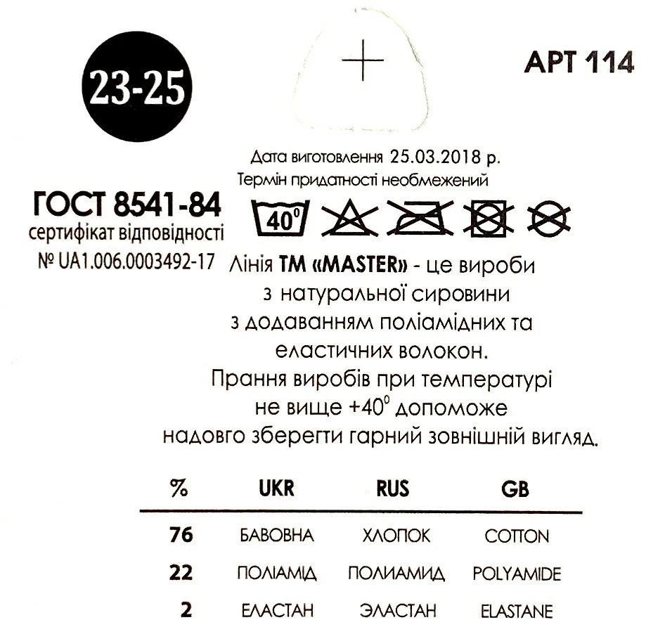 Склад: бавовна — 76%, поліамід — 22%, лайкра — 2%.