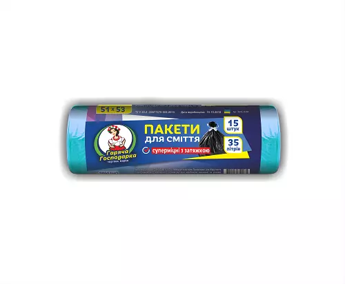 Фотография 1 товарной позиции интернет-магазина детских игрушек www.smarttoys.com.ua 35л/15шт СУПЕР МІЦНІ Пакет для сміття з затяжками ТМ Гаряча Господарка (51*53 см) 13 г/м? 30шт/ящ