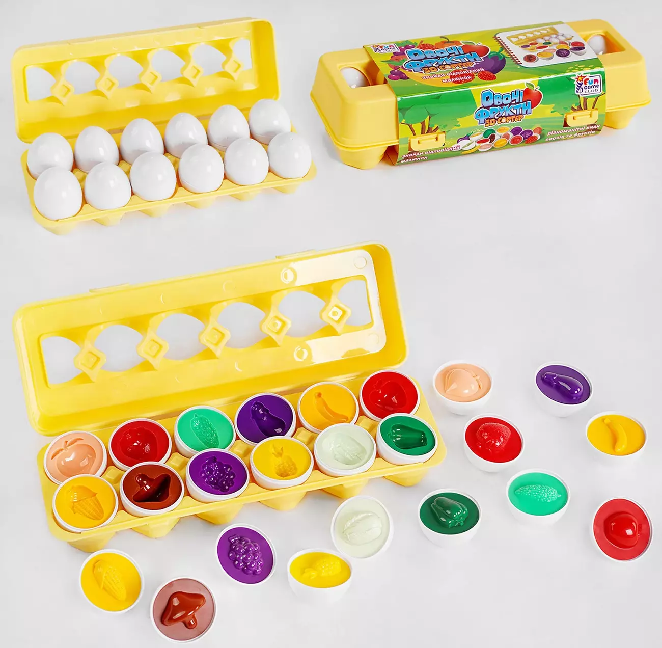 Ранній розвиток дитини неможливий без іграшок, що розвивають. Адже грати та вчитися так весело! Розвивальна іграшка “Яйця 3D сортер. Овочі та фрукти” допоможе розвинути у допитливого малюка спритність рук, дрібну моторику, а також навчать його комбінувати предмети за кольорами та формами! Особливості: - сучасний дизайн; - гармонійне поєднання кольорів; - усередині кожного яйця заховано 3D зображення овочів та фруктів; - серцевини пофарбовані в яскраві унікальні кольори; - компактна коробочка у вигляді лотка для яєць; - всі предмети у грі виконані із безпечного гіпоалергенного пластику.