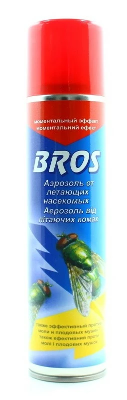 Аэрозоль от летающих насекомых BROS сочетает в себе несколько современных активных веществ эффективных там, где насекомые выработали иммунитет на применяемые до сих пор препараты, обладает эффектом молниеносного действия на насекомых (мухи, мошки, дрозофилы, комары, моль).