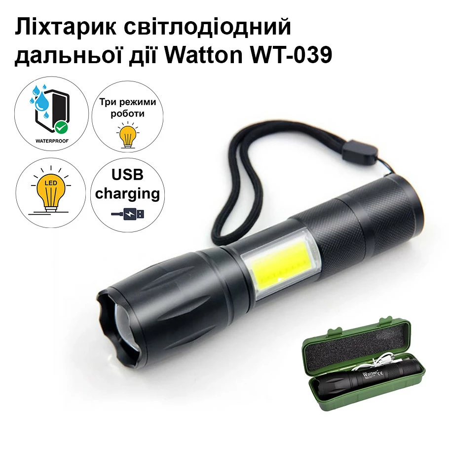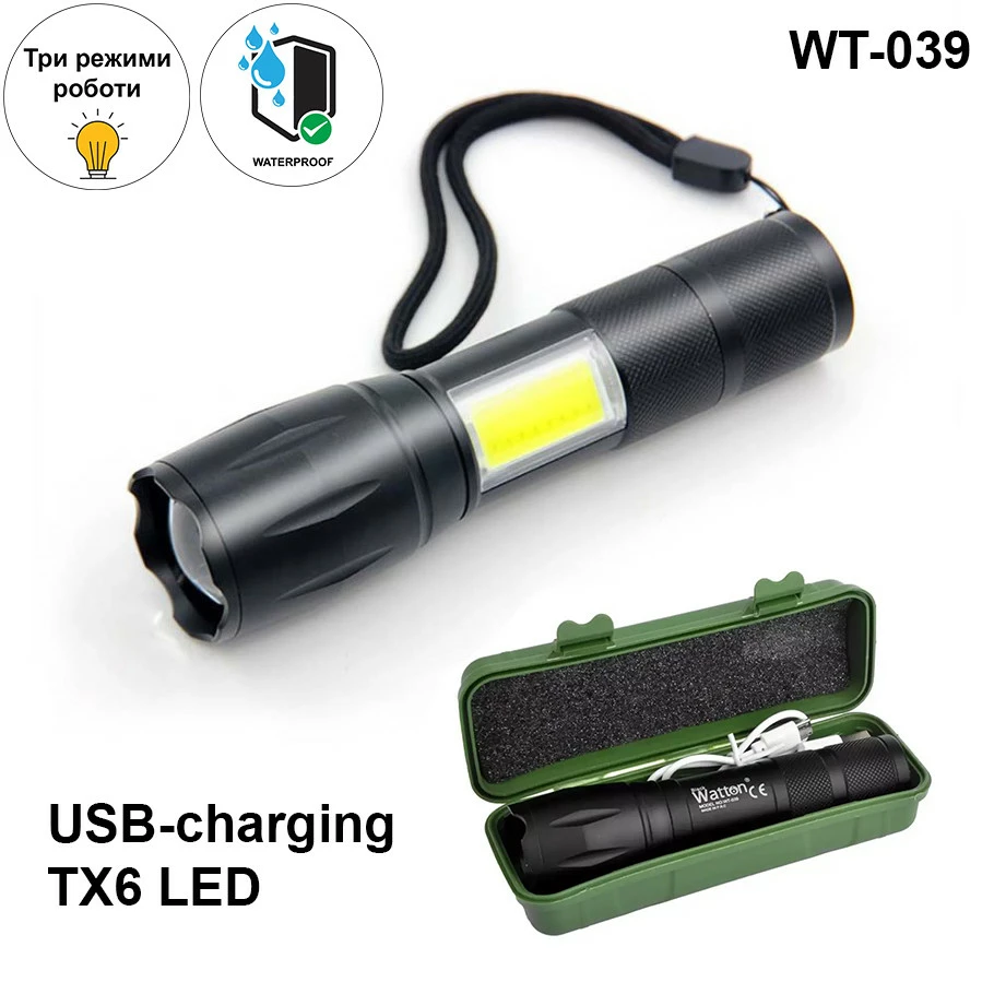 Аккумуляторный светодиодный фонарик Watton WT-039 изготовлен из