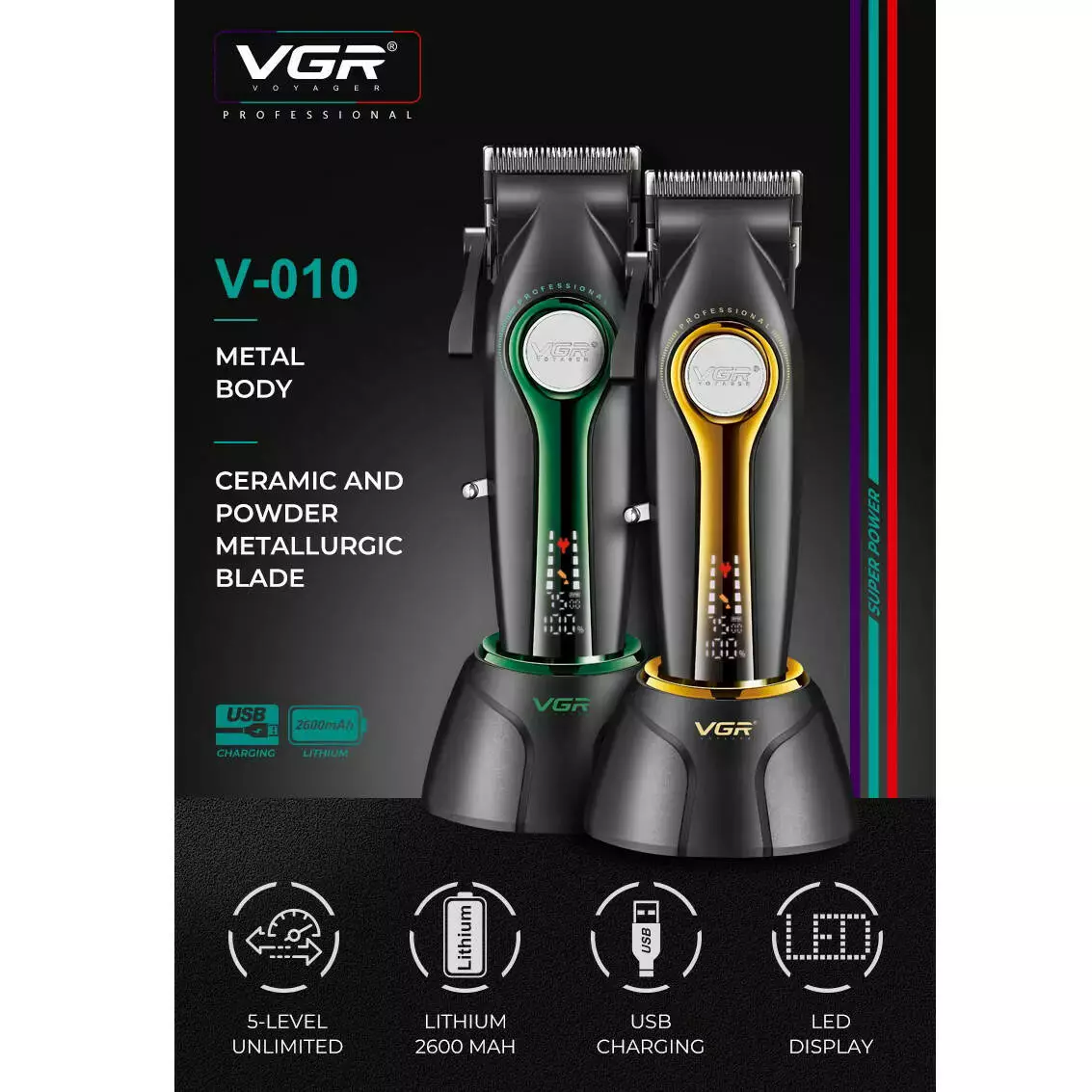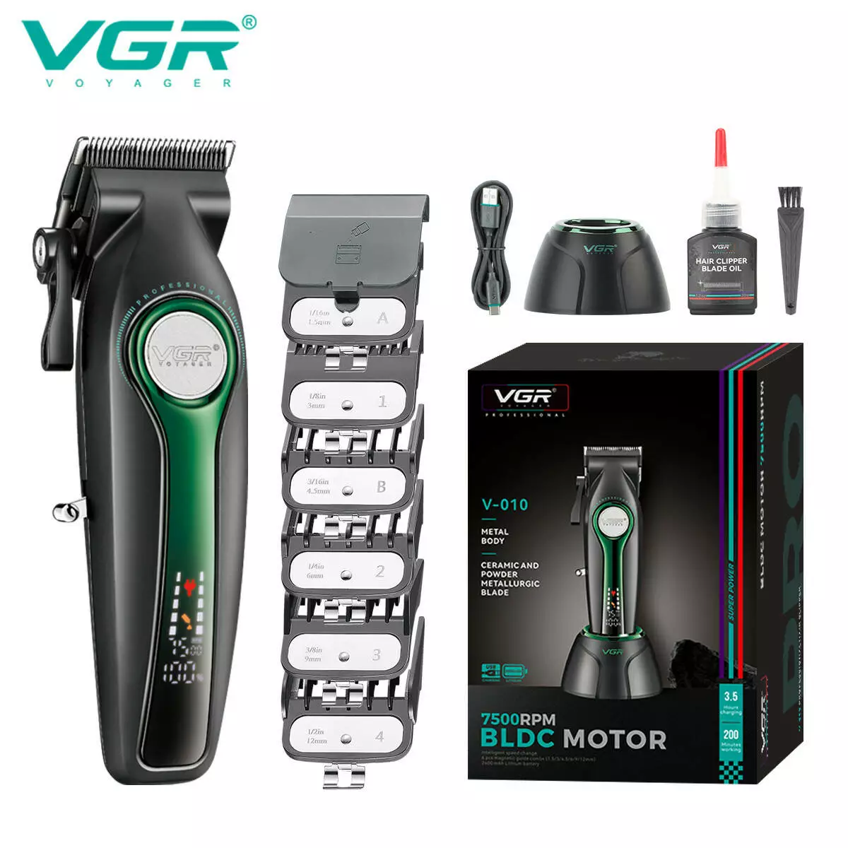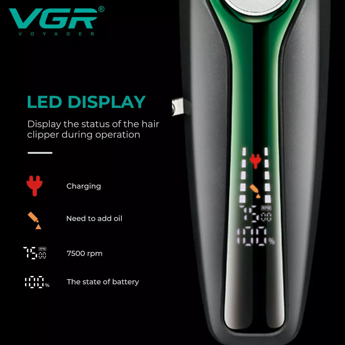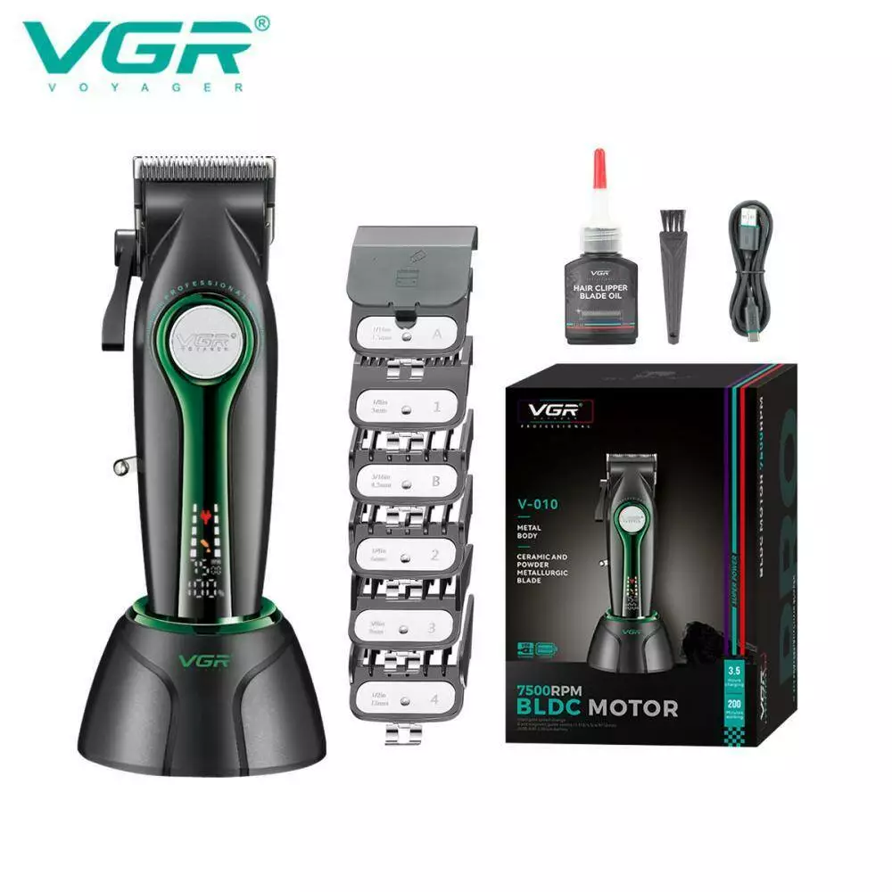 Акумуляторна машинка для стриження (clipper) VGR V-010 GREEN, 6 насадок, 7500 RPM, 2600 mAh, LED display