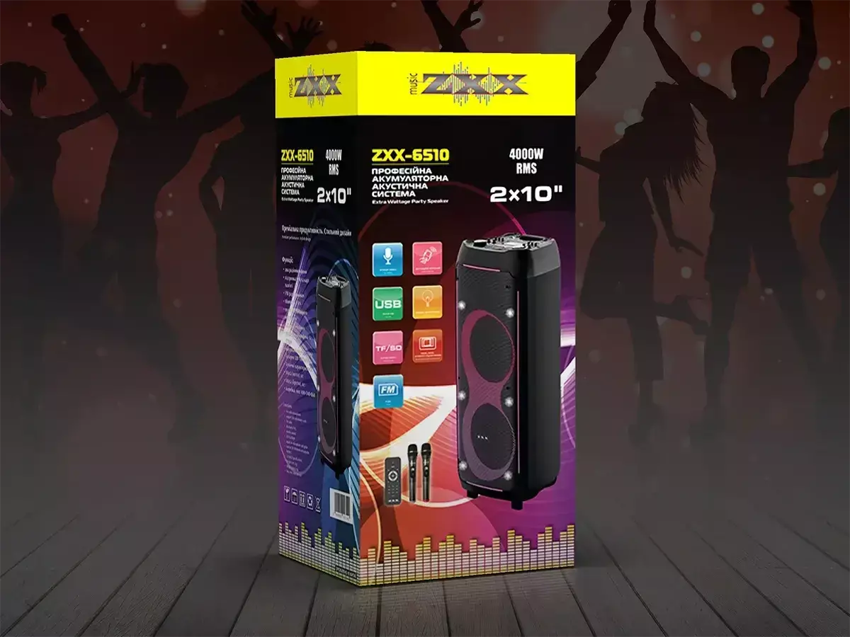 Акустична переносна колонка ZXX-6510 100Вт 2x10" TWS/FM/USB/TF/BT/REC/LED/2MIC/ДК/ 6291