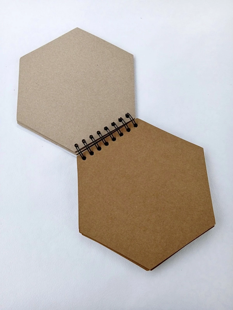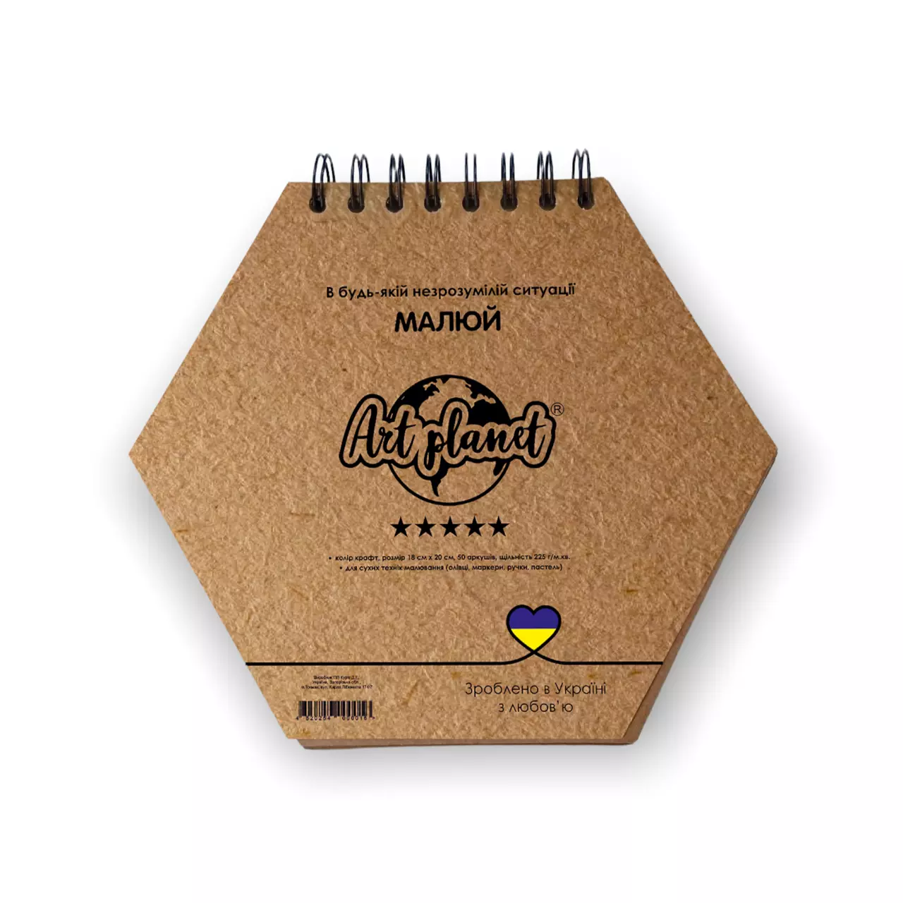 Тогда обратите внимание на фирменный шестиугольный крафтовый альбом, размером 18 см*20 см с твердой обложкой на спирали от Art Planet на 50 листов.