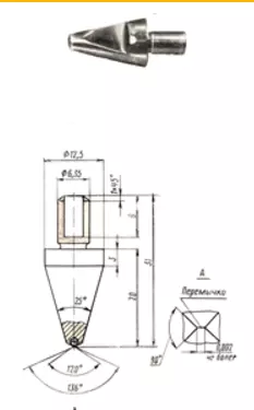Наконечник типа ЧП с рабочей частью в виде четырехгранной пирамиды. Выпускается прибору для измерения твердости по методу Виккерса (НП).