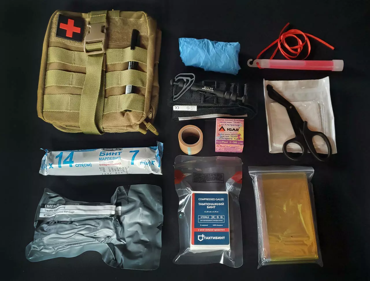 Бинт марлевый|Пакет перевязочный |Салфетка стерильная |Жгут кровоостанавливающий|Ножницы|Перчатки медицинские|Термопокрывало|Повязка ИПП|Бандаж