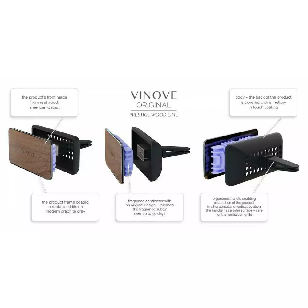 Эксклюзивные духи VINOVE созданы международной командой легендарных французских дизайнеров парфюмерии, итальянских дизайнеров и польских ученых. Автомобильные духи VINOVE находятся в полностью безопасном для интерьера автомобиля, прочном полимерном корпусе аромадиффузора, который вмещает ароматический конденсатор.