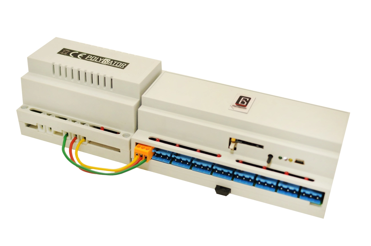 Устройство управляет восемью каналами с напряжением 24В. Каждый канал включается и выключается по команде своего таймера и может быть подключен к электроклапану (при помощи клапана можно дистанционно управлять подачей требуемого объема жидкости в тот или иной момент времени), также устройство снимает показания внешних датчиков – выносной для измерения температуры и влажности и четыре охранных.
