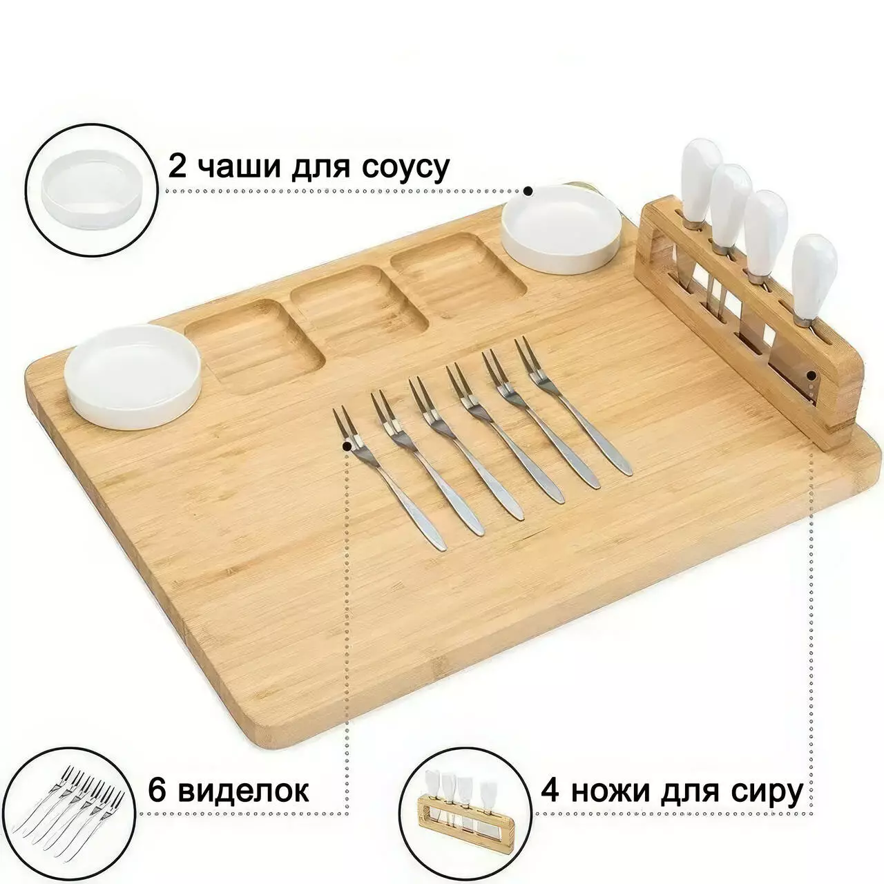 Комплектація: дошка, 4 ножі для сиру, 6 виделок, 2 керамічні