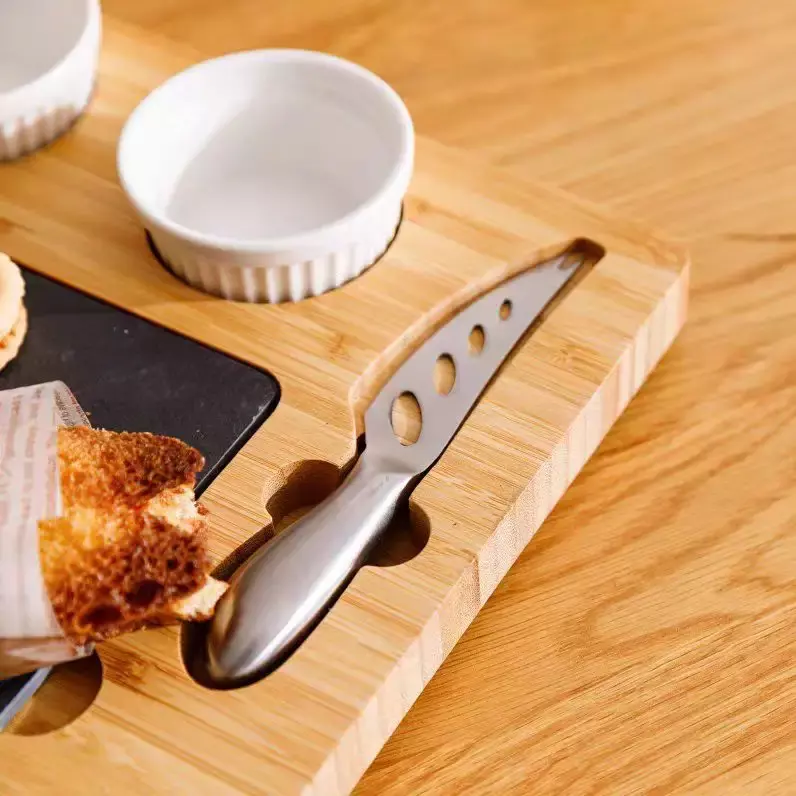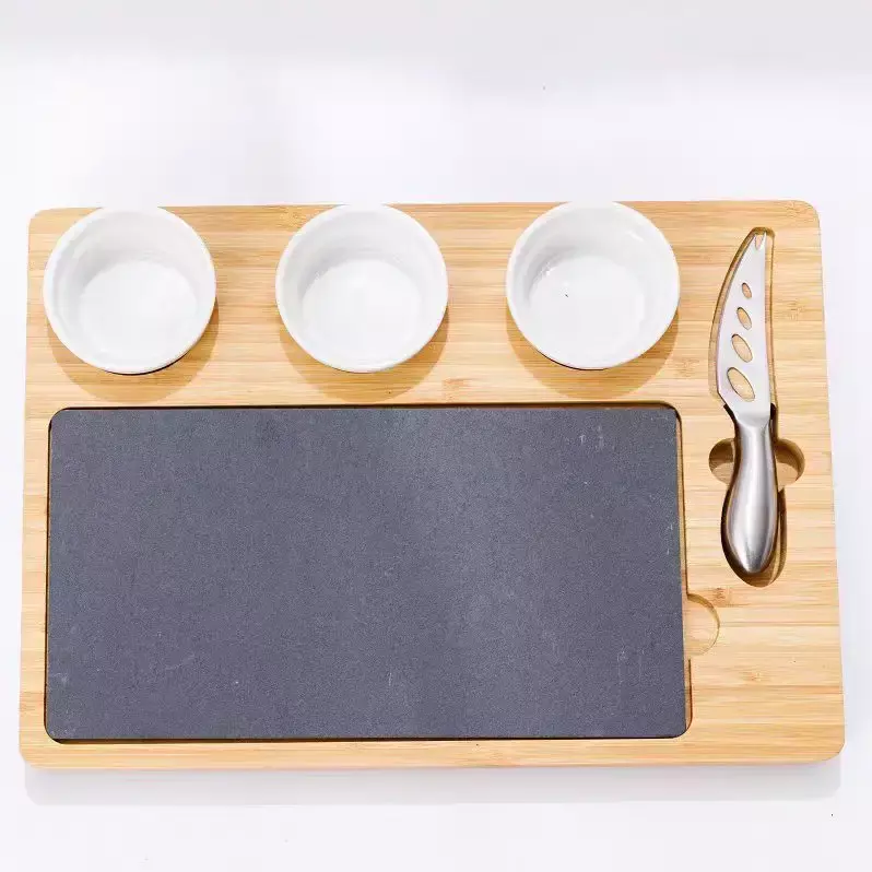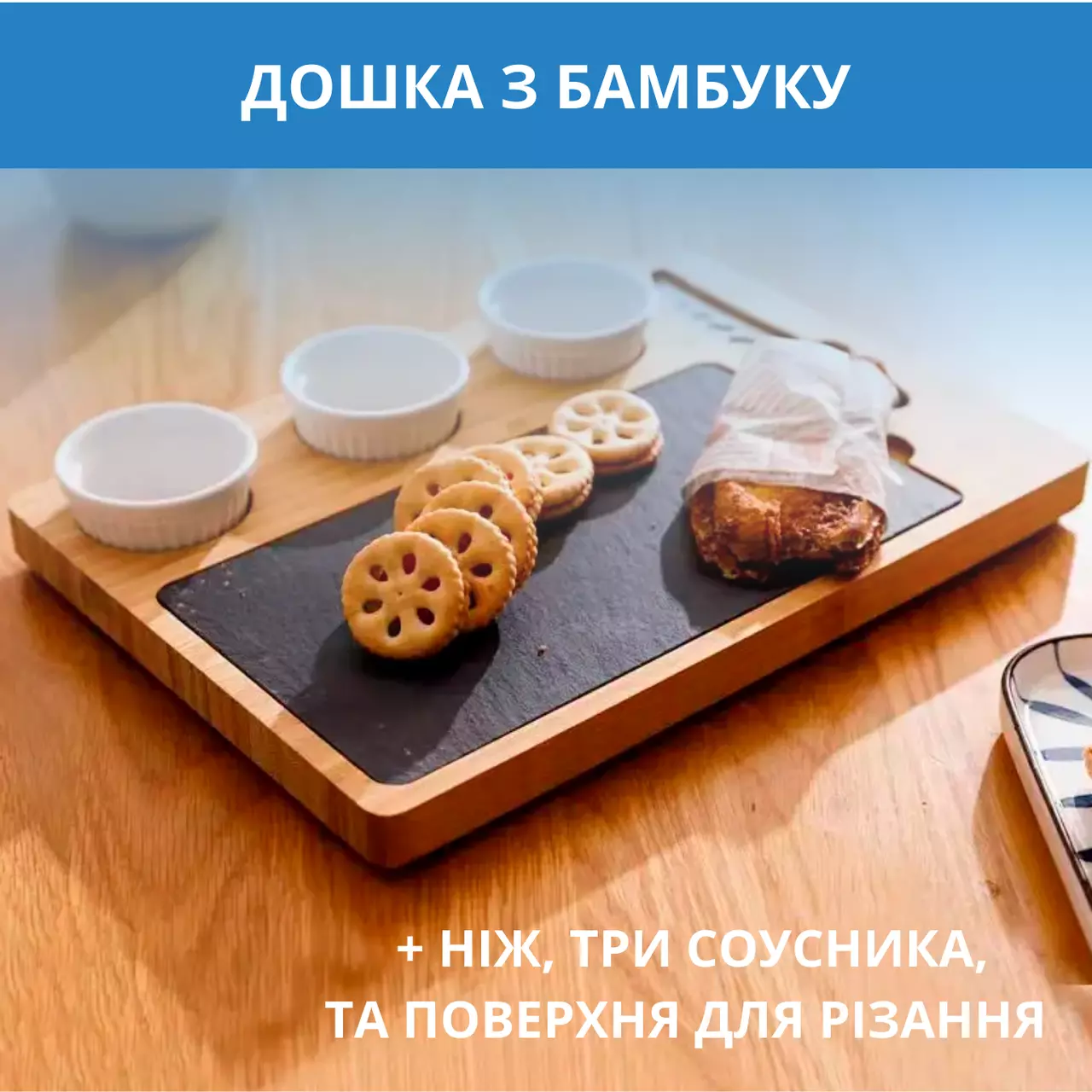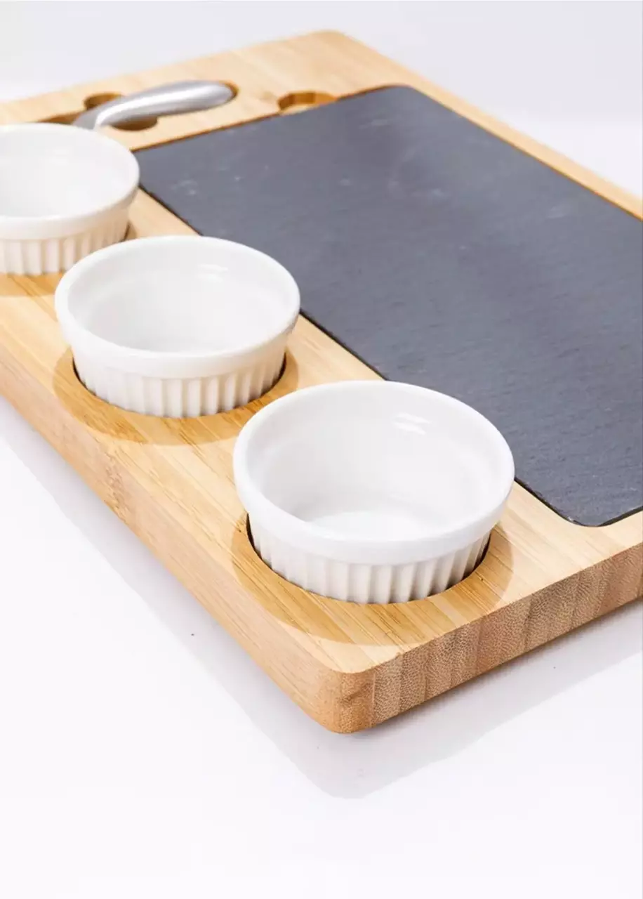 Комплектация: доска, нож для сыра, 3 керамических соусника