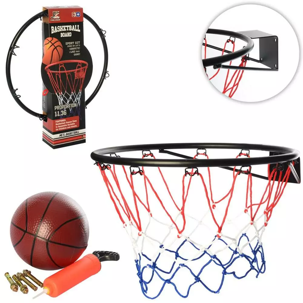 Фотография 1 товарной позиции интернет-магазина детских игрушек www.smarttoys.com.ua Баскетбольне кільце MR 0168 кільце (мет.), сітка, м'яч, насос, кріплення, кор., 46-53-11см.