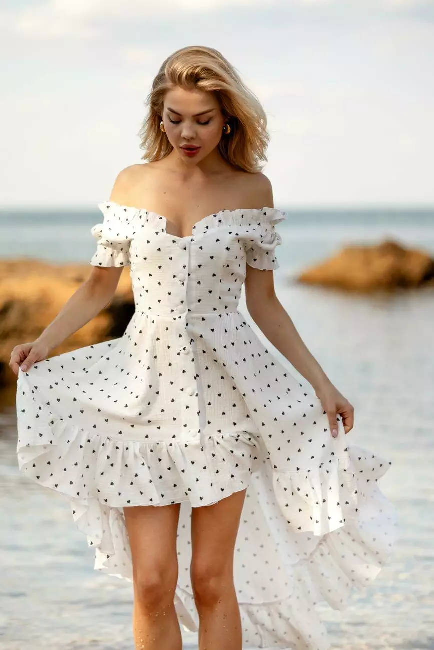 Главная > Каталог > Женская одежда > Платья > Бавовняна ніжна сукня MIRANDA з відкритими плечима з квітковим принтом колір сердечки чорні на білому оптом