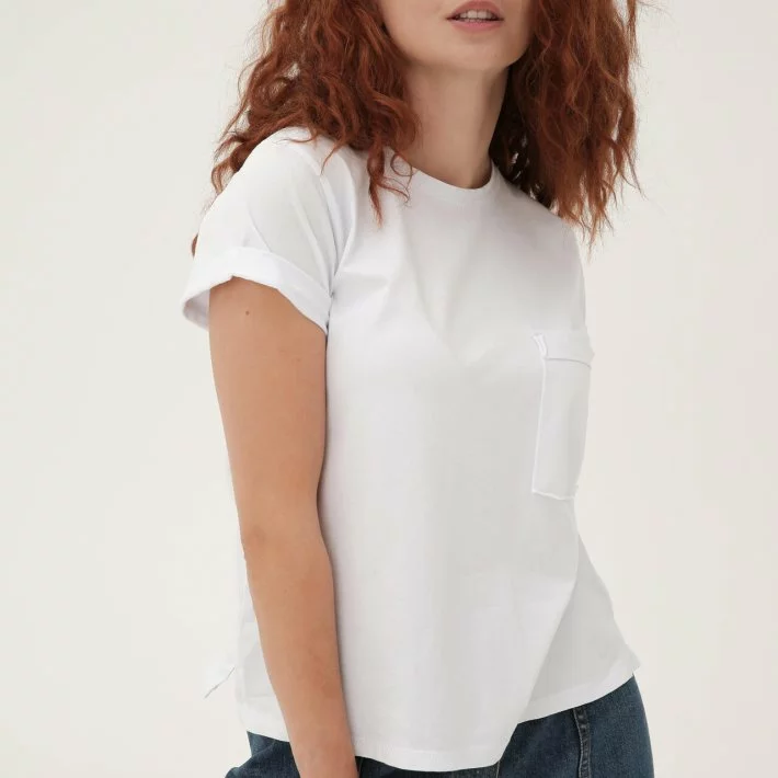 Лаконічна та стильна біла бавовняна футболка. Оздоблена карманом по