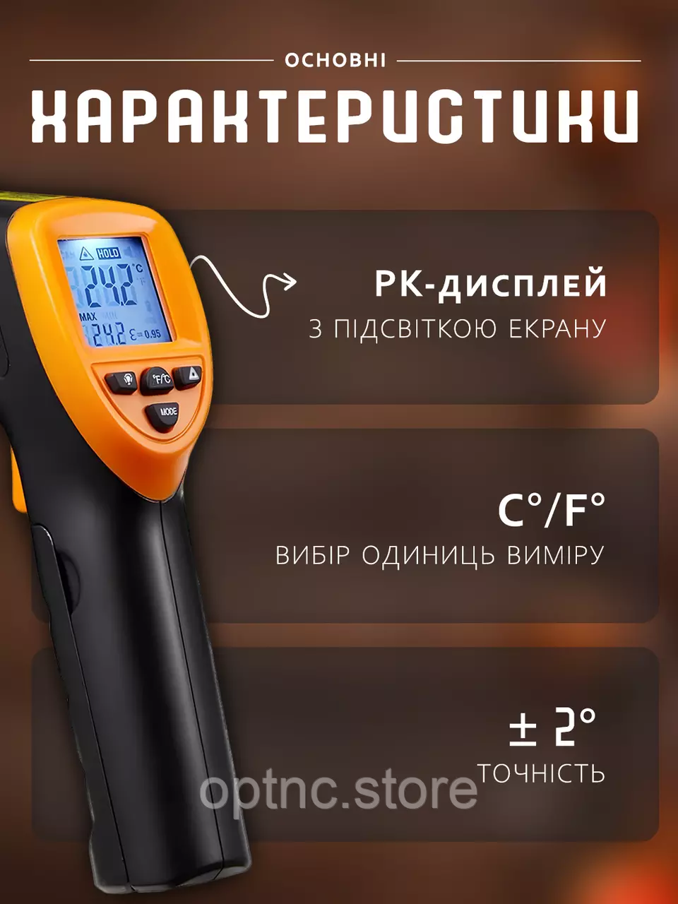 возможность использовать днём/ночью, благодаря подсветке дисплея; отображает показания температуры < 1 секунду; лазерный указатель для точного наве