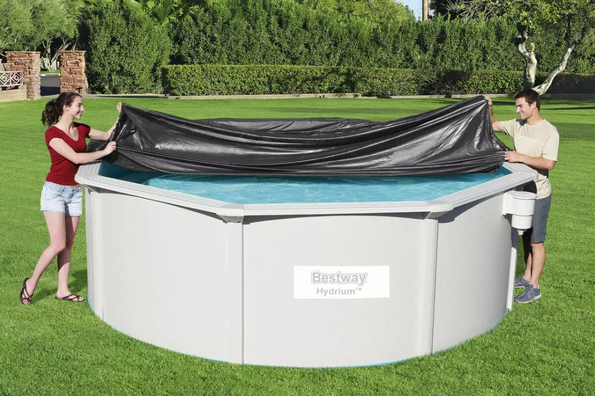 Покривало Bestway діаметром 427 см – ефективний спосіб захистити воду у басейні від забруднень і зменшити випаровування. Також підходить для зимового накриття. Натягується на краї чаші басейну та фіксується міцним шнуром.