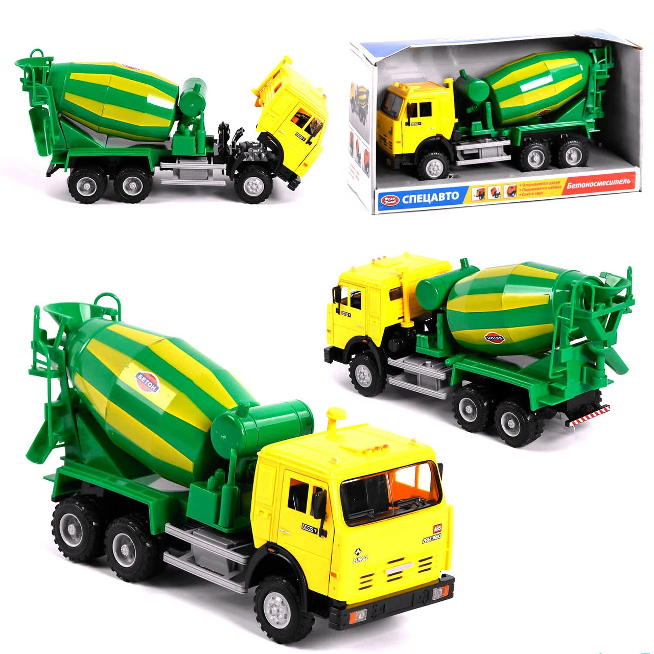 Бетоновоз окрашен в броский зеленый цвет, который с первых секунд