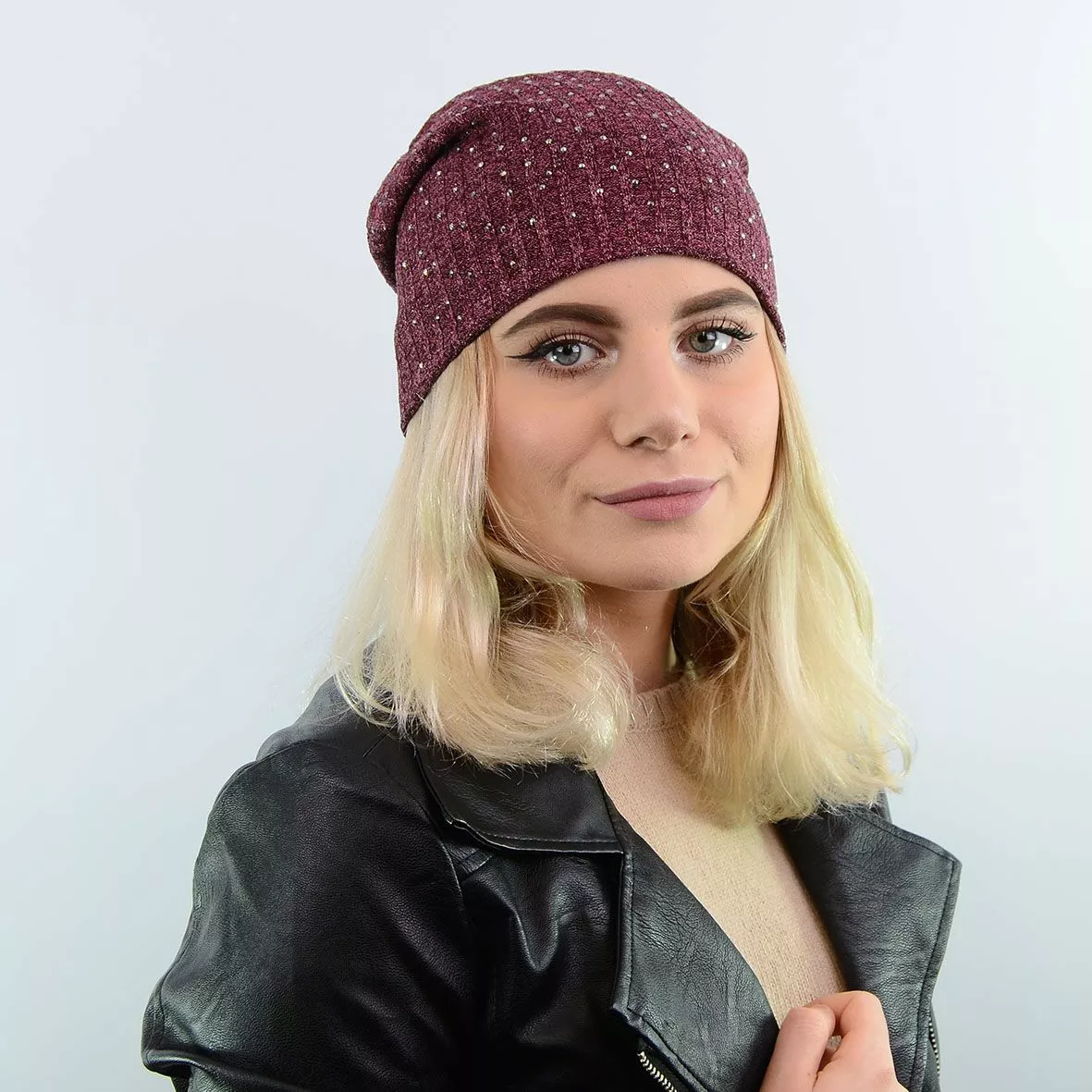 Двухслойная трикотажная шапка с люрексом, удлиненной формы,