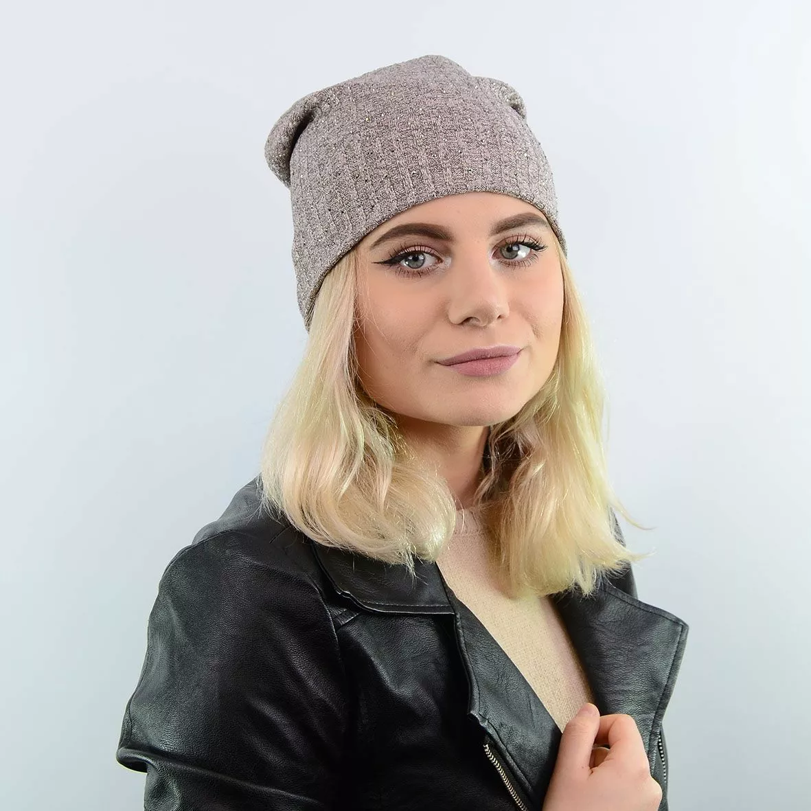 Двухслойная трикотажная шапка с люрексом, удлиненной формы,