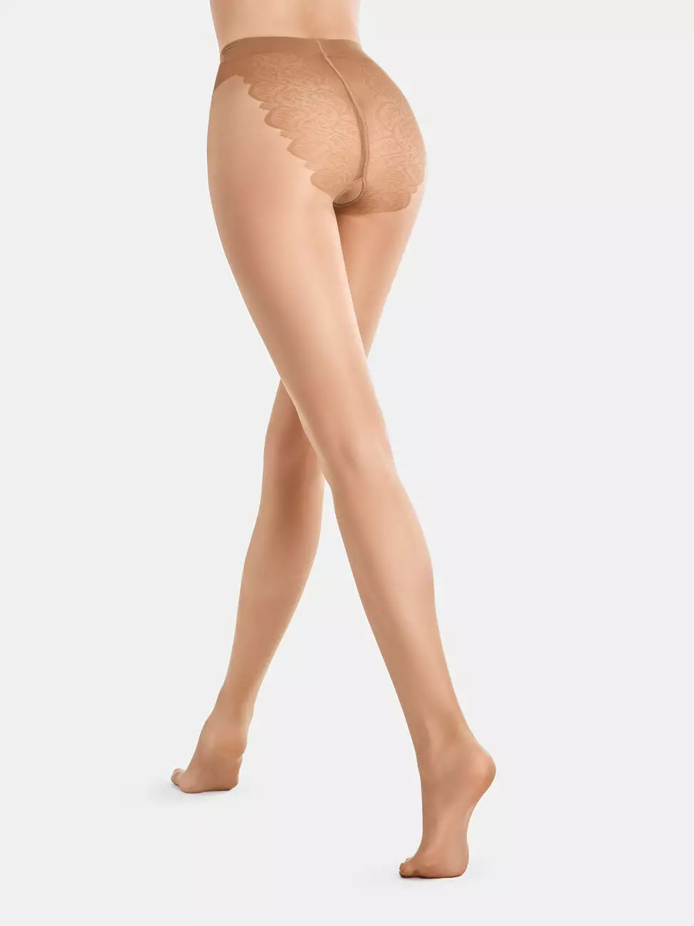 Жіночі колготки 20 DEN з напівматовою текстурою — витончений варіант для щоденного гардероба. Середня посадка забезпечує комфортну фіксацію по фігурі. Ажурні трусики створюють легкий утягуючий ефект, підкреслюючи силует. Пласкі шви та бавовняна ластовиця гарантують зручність і непомітність під одягом.