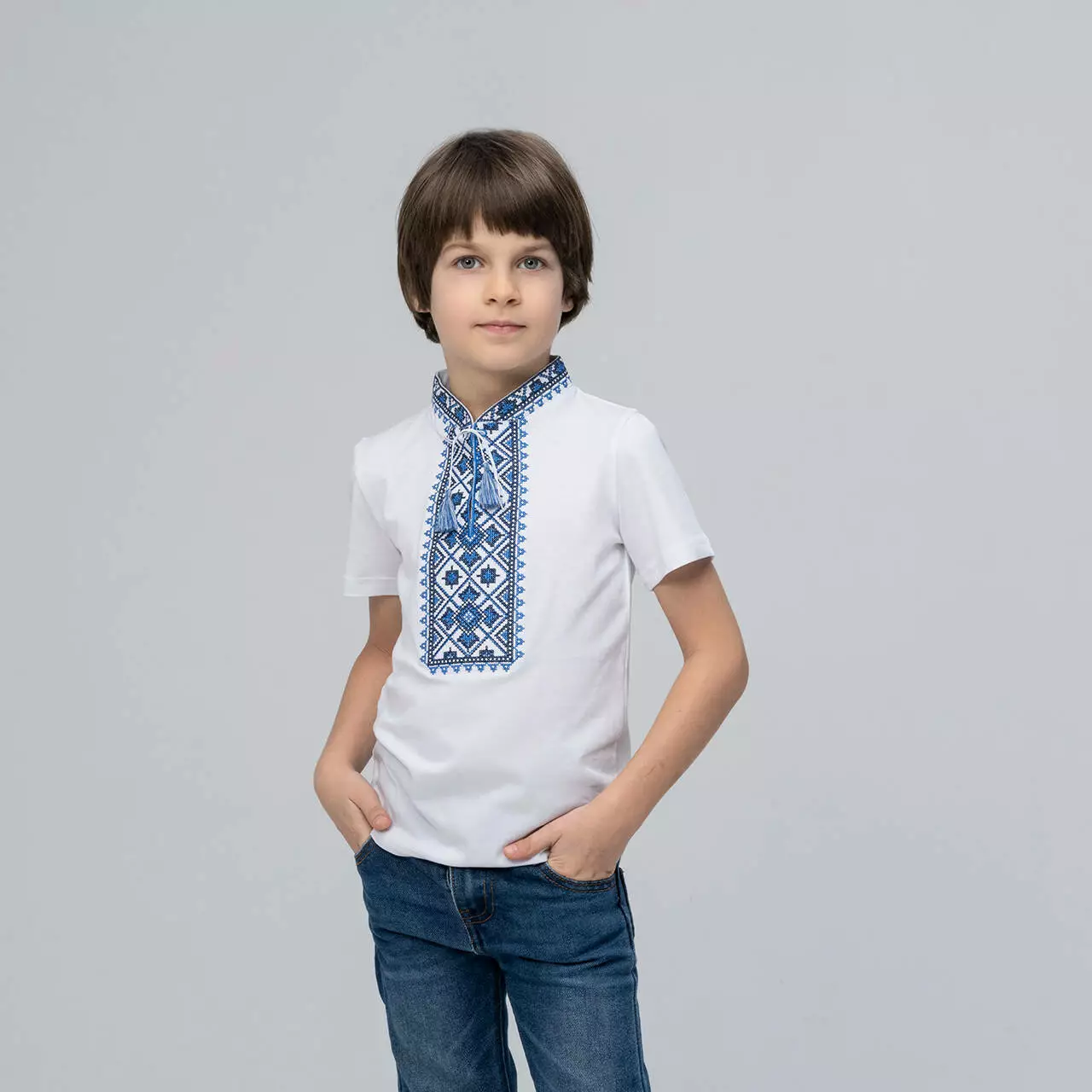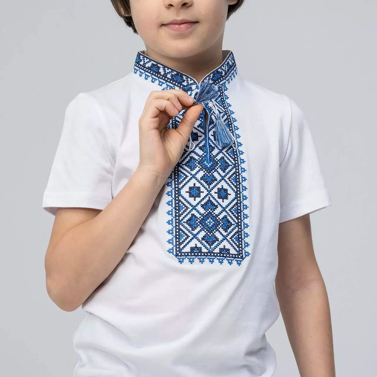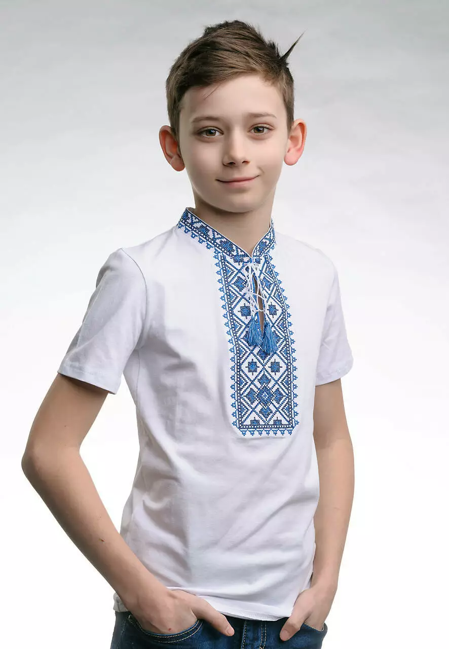 Вишита футболка для хлопчика "Зоряне сяйво". Футболка білого кольору оздоблена вишивкою на грудях синього кольору з кутасиками. Виготовлена з натуральної бавовни, яка приємна та ніжна на дотик. Футболку підкреслює український стиль геометричний візерунок. Цей візерунок уособлює гармонію та спокій кожної людини, яка має у своєму гардеробі вишиванку. Вишита футболка для хлопчика знадобиться як для шкільних свят так і для святкових подій вашої сім'ї. Підкреслить стильність та патріотизм шкірного козачка. Поспішайте придбати якісні та стильні вишиванка за доступними цінами в нашому інтернет-магазині "Меланіка"!