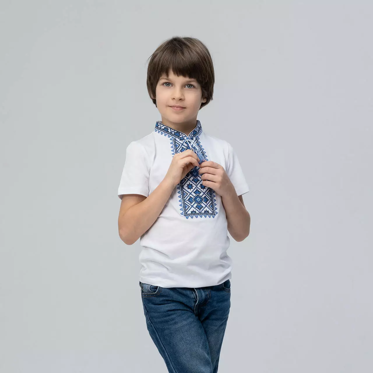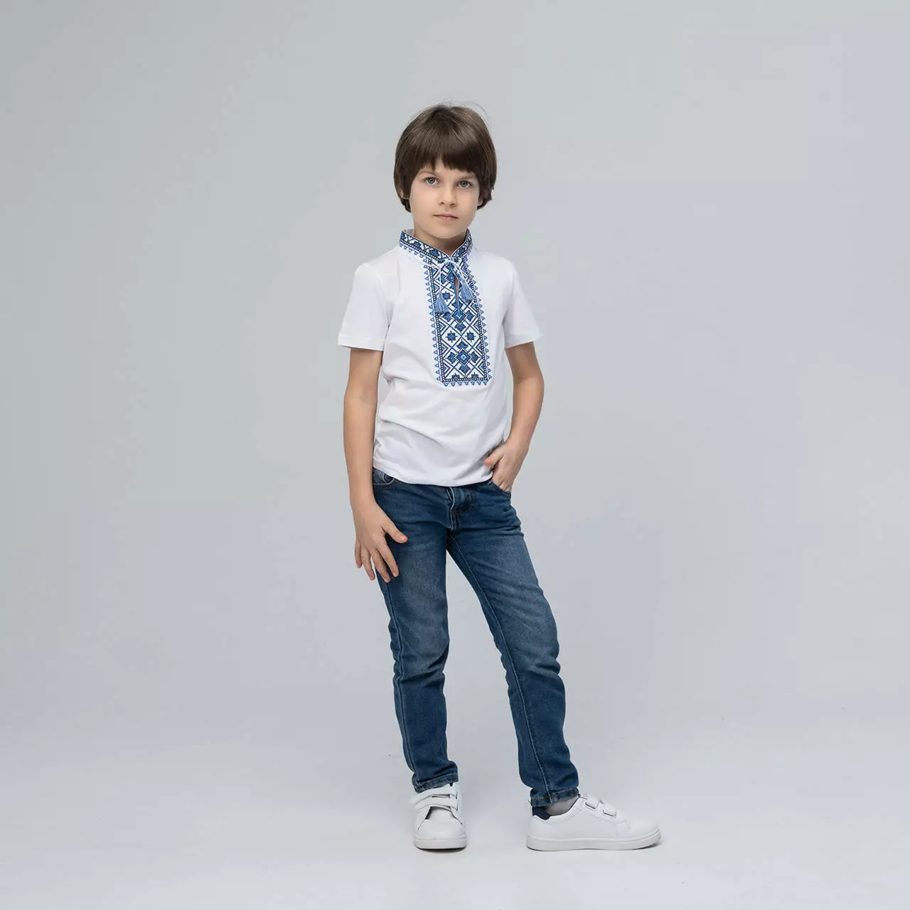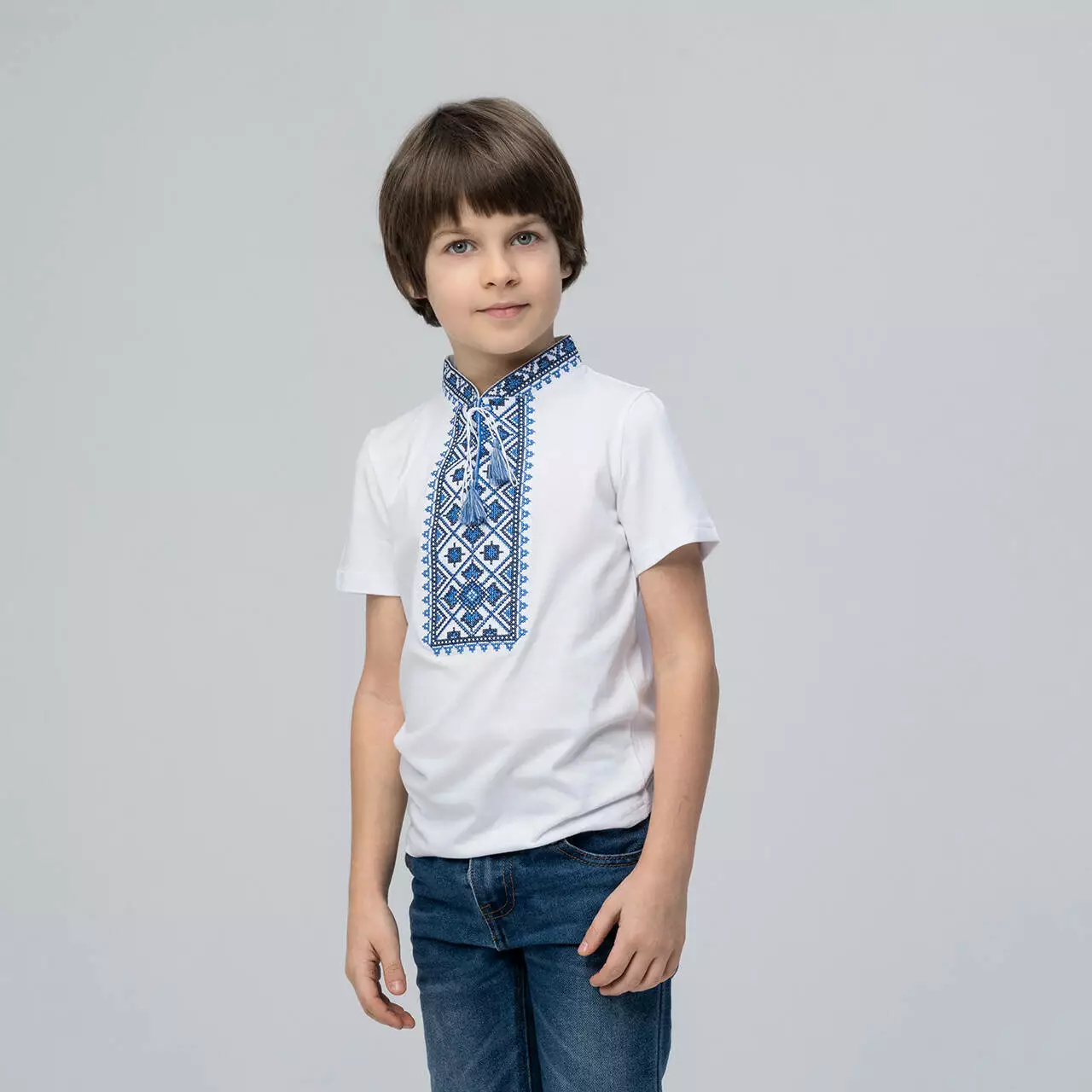 Вишита футболка для хлопчика "Зоряне сяйво". Футболка білого кольору оздоблена вишивкою на грудях синього кольору з кутасиками. Виготовлена з натуральної бавовни, яка приємна та ніжна на дотик. Футболку підкреслює український стиль геометричний візерунок. Цей візерунок уособлює гармонію та спокій кожної людини, яка має у своєму гардеробі вишиванку. Вишита футболка для хлопчика знадобиться як для шкільних свят так і для святкових подій вашої сім'ї. Підкреслить стильність та патріотизм шкірного козачка. Поспішайте придбати якісні та стильні вишиванка за доступними цінами в нашому інтернет-магазині "Меланіка"!