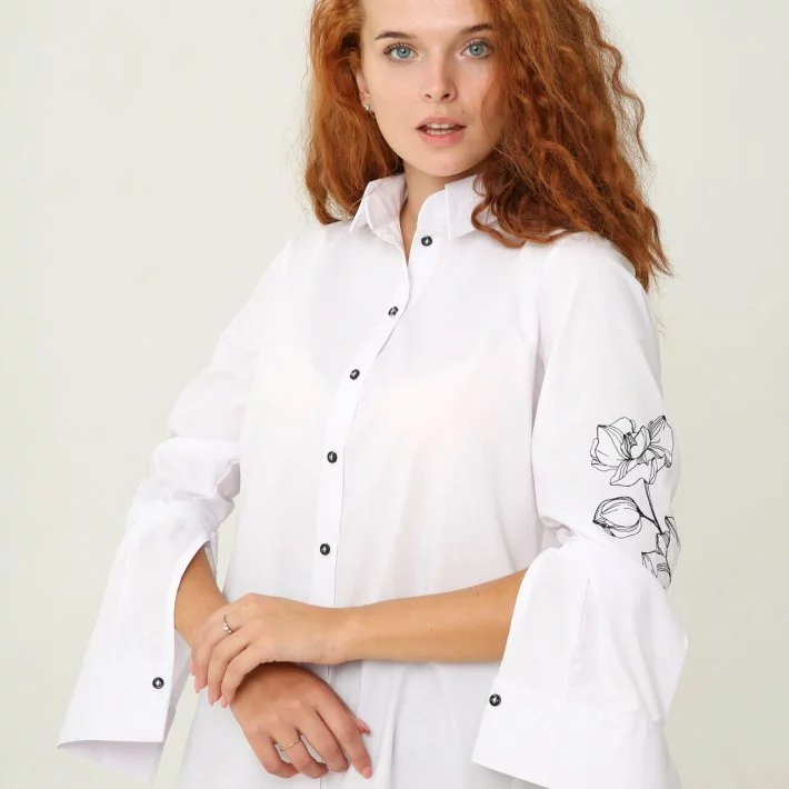 з широким манжетам і глибокими розрізами. На блузі виконана вишивка