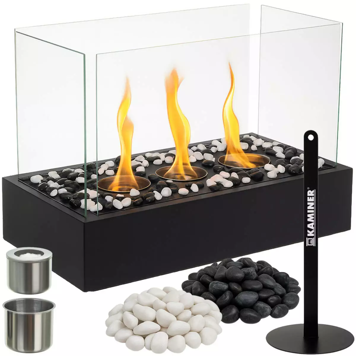 Вільностоячий біокамін KAMINER працює на біоетанолі, створюючи живе полум’я без диму, кіптяви та запаху. Чотири прозорі скляні стінки підкреслюють гру вогню та забезпечують безпеку. У комплекті чорні й білі камінці для стильного оздоблення та вигасник для зручного гасіння полум’я.