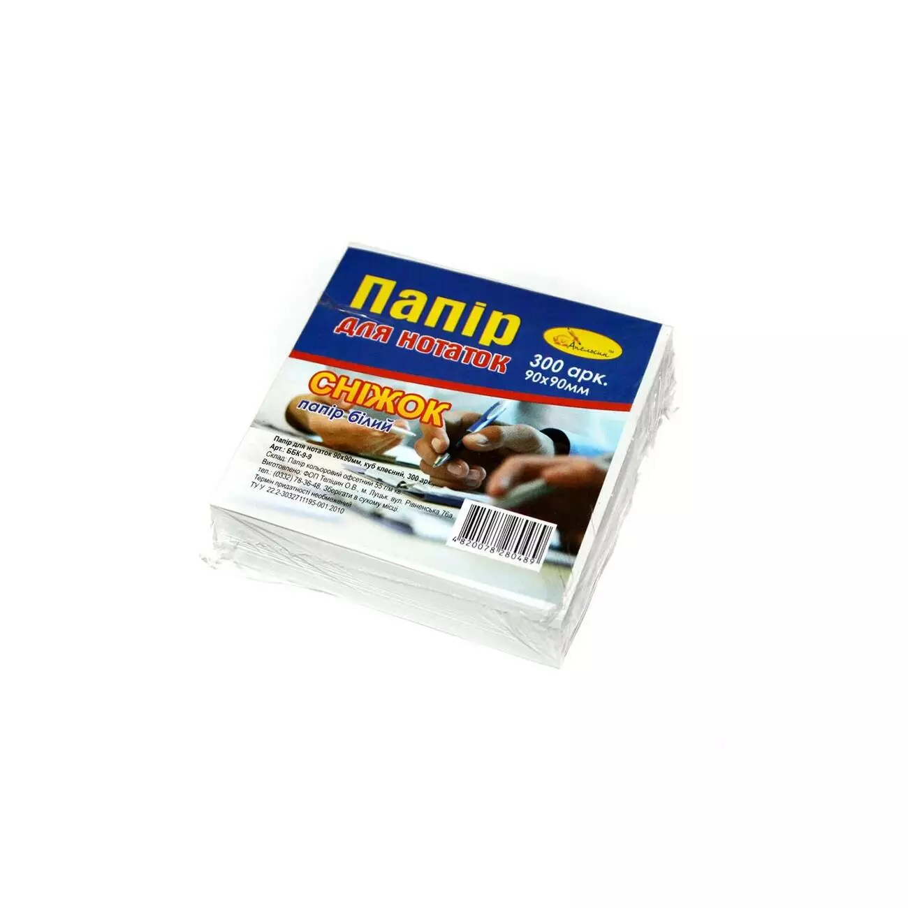 Склад: папір кольоровий офсетний 55 г/м2. Упаковка: термозбіжна плівка. Розмір: 90х90 мм.