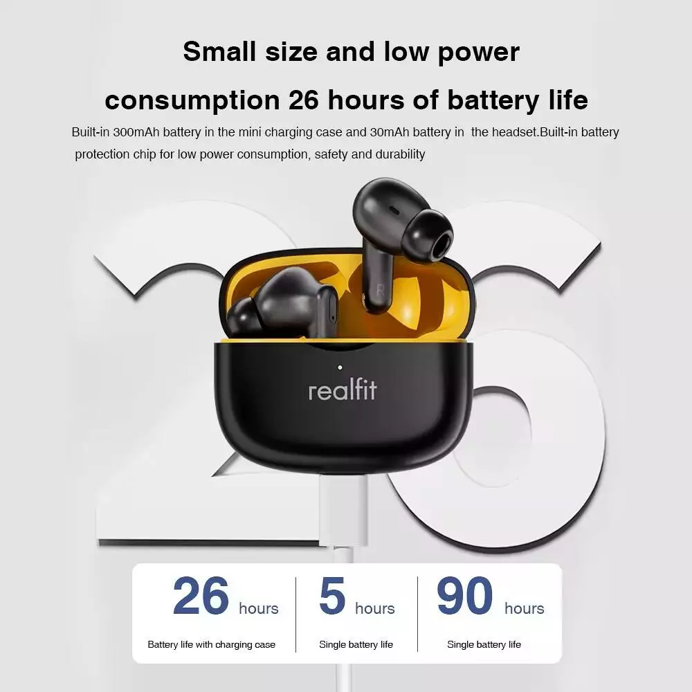 Бездротові навушники Realfit F3 оснащені вбудованою батареєю ємністю 30 мАг, що забезпечує до 5 годин безперервного відтворення музики або розмов. Але це ще не все! У комплект входить компактний зарядний кейс із батареєю ємністю 300 мАг, що дозволяє продовжити час роботи навушників до 26 годин. Це ідеальне рішення для тривалих поїздок та активного використання протягом дня.
