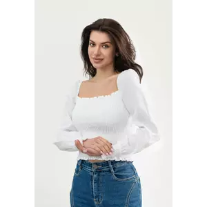 Дизайн блузи відзначається об'ємними рукавами з буфами, які додають образу особливого шарму та роблять її справжньою родзинкою. Буфи надають рукавам об’єм і створюють легкий, романтичний стиль, додаючи жіночності та вишуканості. Такий фасон підкреслює лінії плечей, роблячи образ виразнішим, а класичний білий колір надає відчуття чистоти та свіжості, що дозволяє легко поєднувати блузу з різними елементами гардеробу.