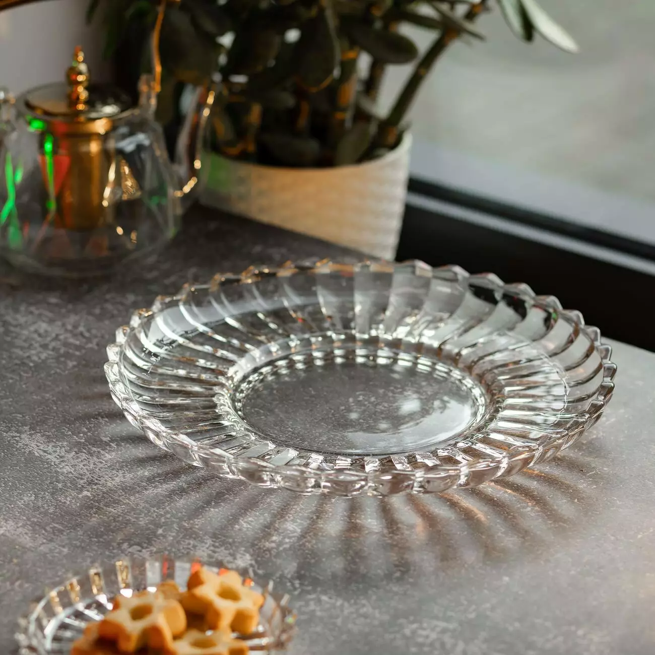Блюдо для закусок виготовлене з товстого скла, що забезпечує його міцність і стійкість до механічних впливів. Діаметр складає 28 см, а висота – 3 см, що дозволяє зручно розміщувати різні види закусок, фруктів або десертів.