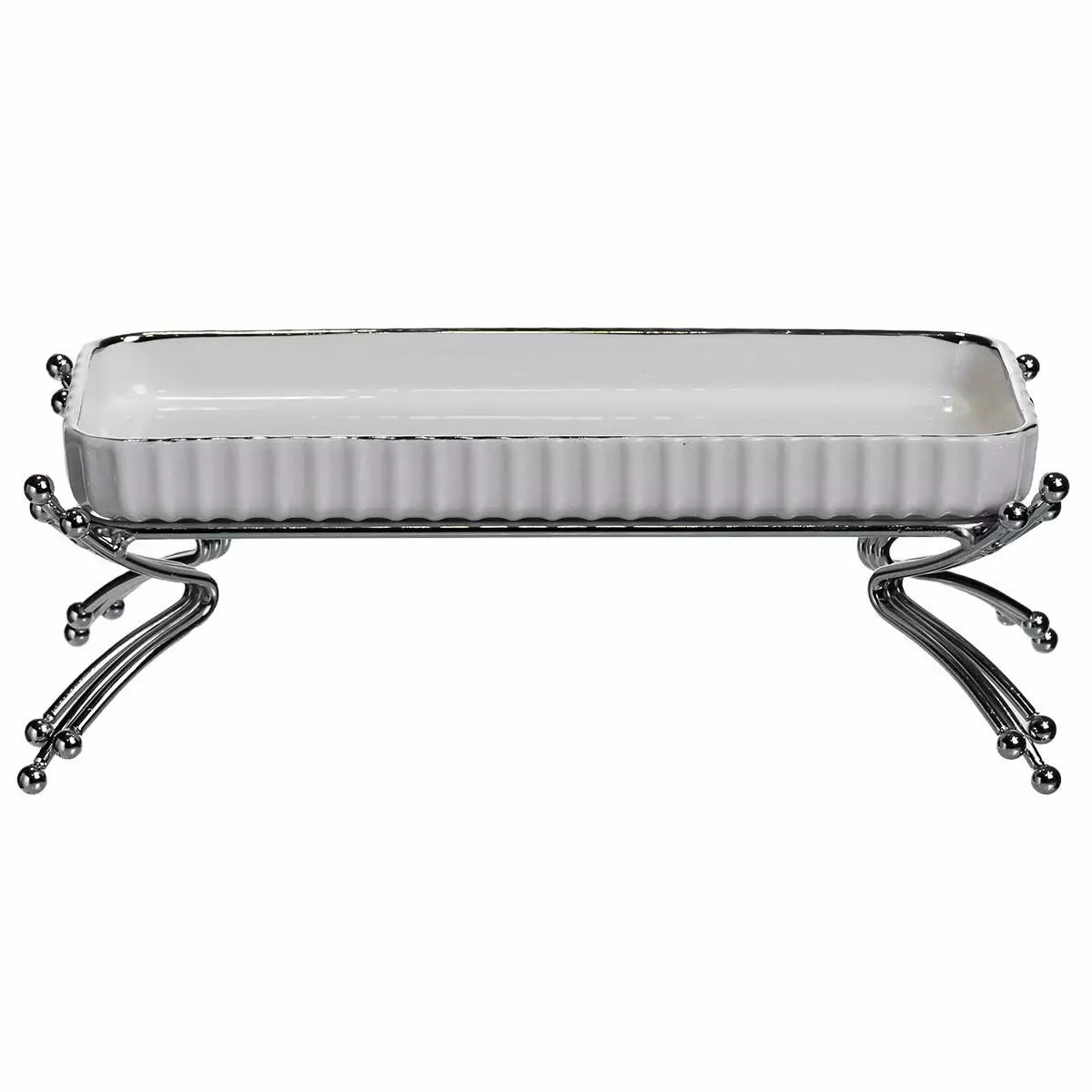 Сервірувальне блюдо на металевій підставці — це практичний елемент для подачі закусок, десертів або фруктів на святковому чи повсякденному столі. Поєднання порцелянової ємності та міцної металевої основи створює зручну конструкцію, яка підкреслює акуратність сервірування. Завдяки універсальній формі блюдо доречно виглядає в будь-якому інтер’єрі — від класичного до сучасного.