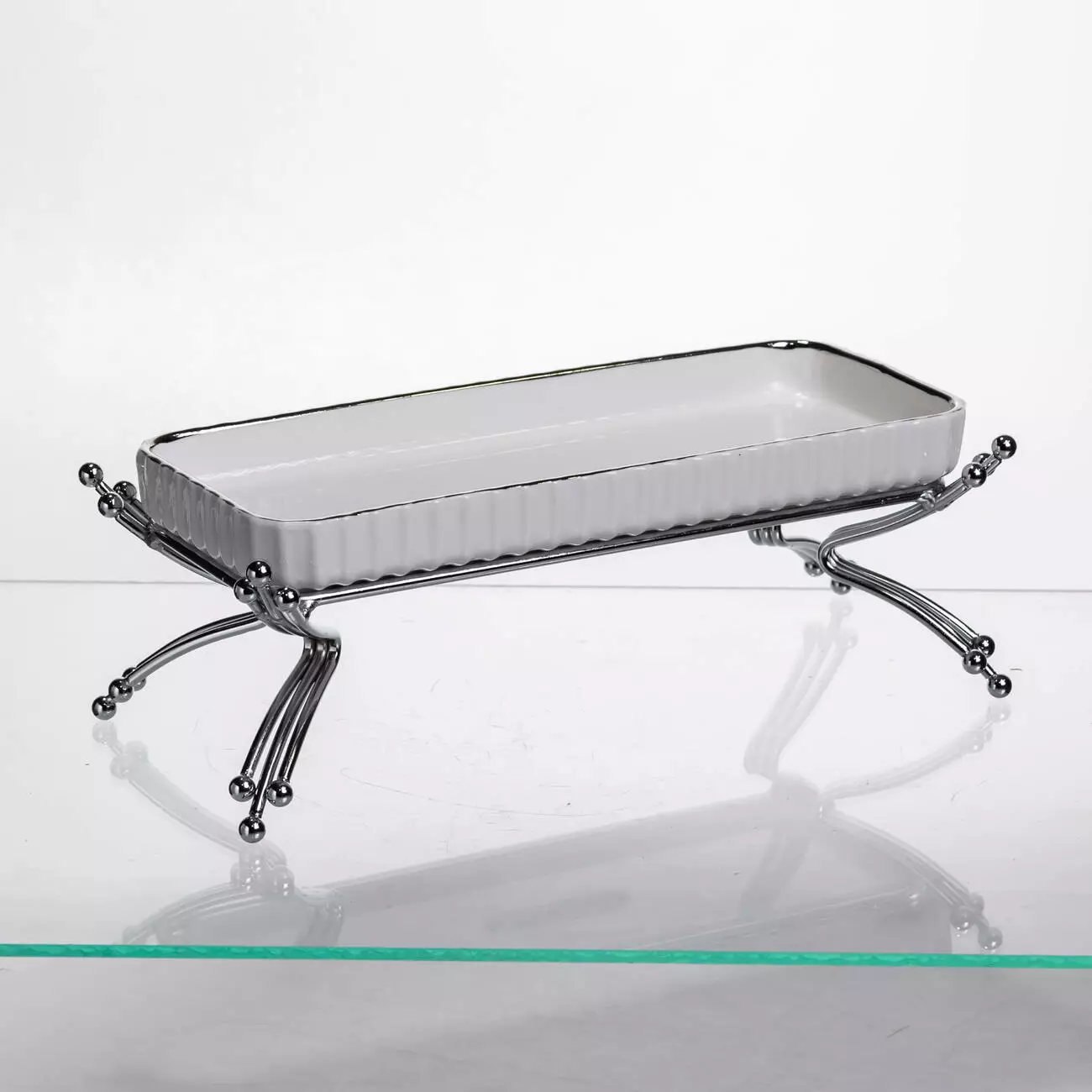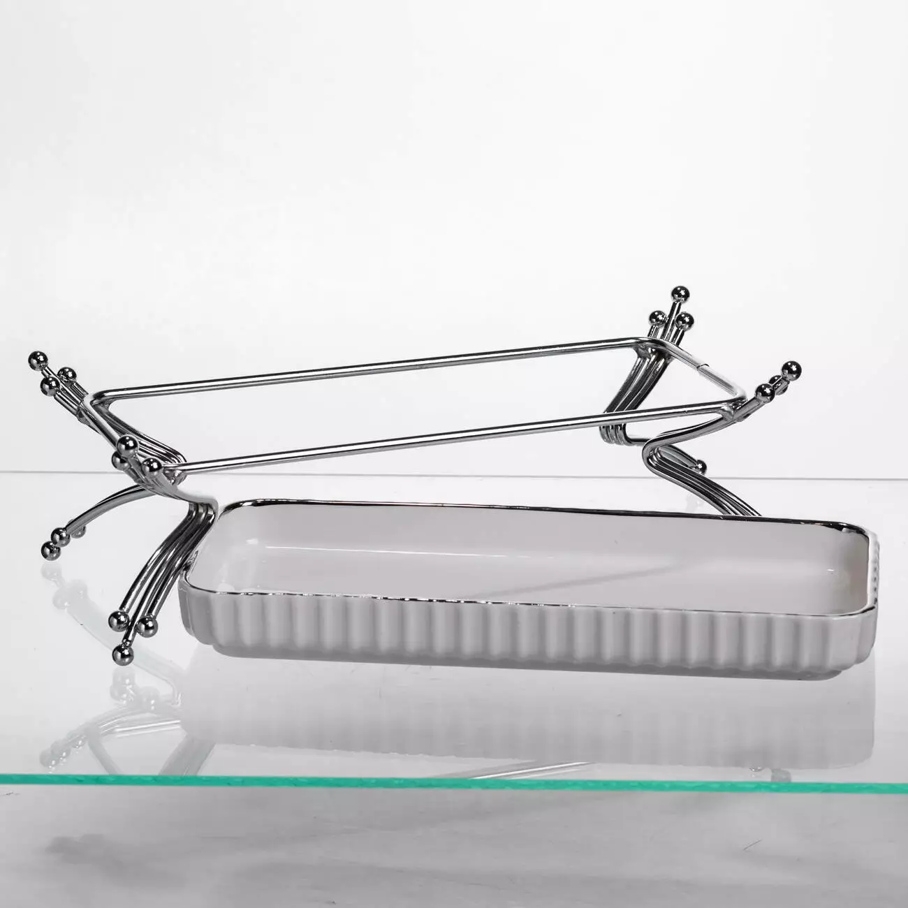 Порцелянова частина має гладку поверхню, стійку до плям і легку в догляді. Її об’єм становить 200 мл, що підходить для подачі невеликих порцій страв. Розміри блюда — 25×10.5×9 см, при цьому висота без підставки становить 2.5 см. Металева підставка забезпечує стабільність та додає виробу елегантності, роблячи подачу більш охайною та естетичною.