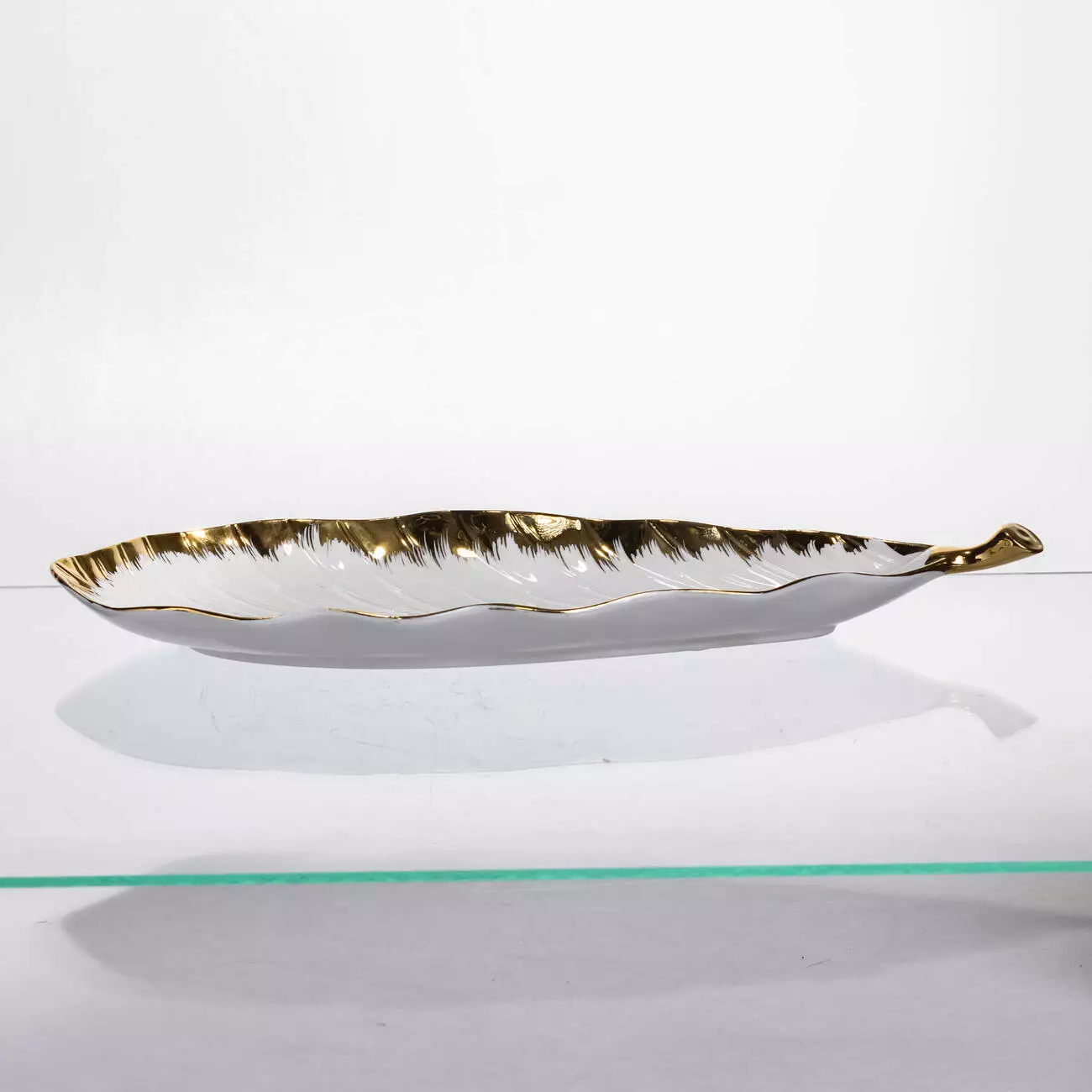 Біле покриття з глянцевим ефектом поєднується з золотистими акцентами по краях, що додає виробу завершеного вигляду. Рельєфна форма у вигляді листка з чітко вираженими прожилками виконує як естетичну, так і практичну функцію. Порцеляна легко миється та не вбирає запахів, що робить блюдо зручним у щоденному використанні.