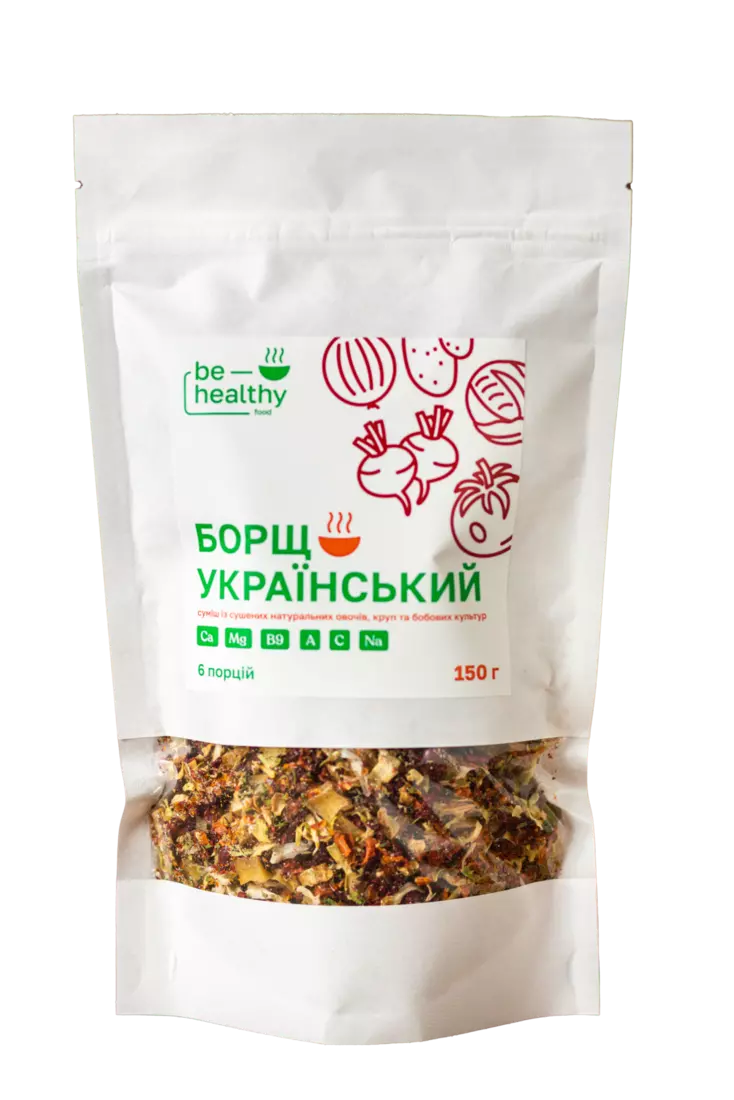 Борщ Український від ТМ BE HEALTHY FOOD - це знахідка для кожної господині. Адже борщ - найулюбленіша перша страва українців. І, відтепер, для його приготування вам необхідно всього лиш засипати суміш в киплячий бульйон або воду та зварити його за вказаним часом. Сушені овочі передають повноцінний смак домашнього справжнього Українського борщу, який за бажанням, ви можете наситити улюбленими спеціями та приправми.