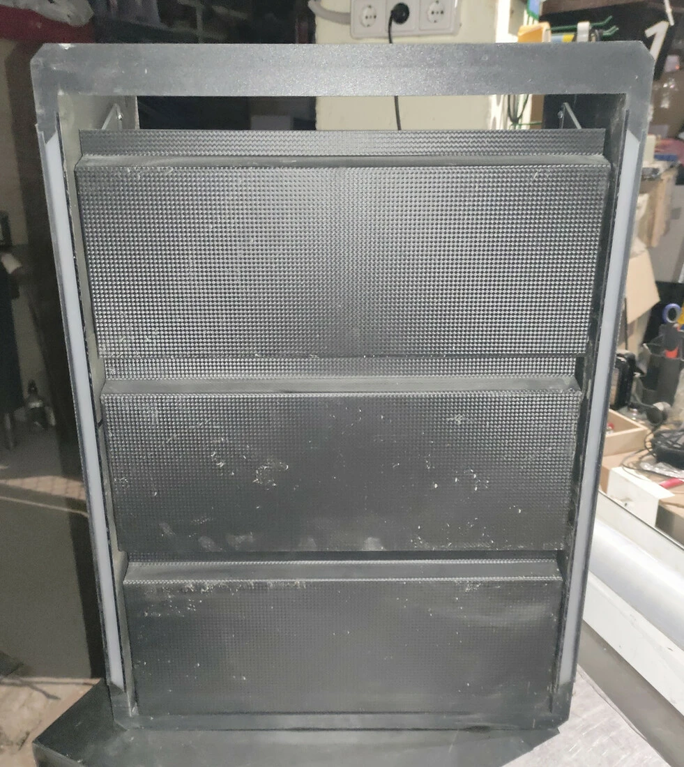 Сигаретний диспенсер з трьома синхронно закриваються полицями. На кожній полиці встановлюються комірки з автоматичними штовхачами пачок.