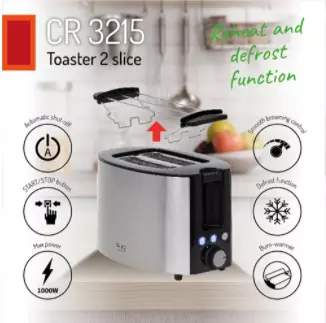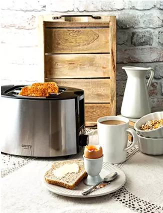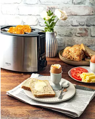 Эффективный тостер мощностью 1000 Вт, в котором можно одновременно готовить два тоста. Ручка регулировки степени поджаривания позволяет приготовить тосты так, как вам нравится больше всего. Благодаря этому они получаются именно такими хрустящими, какими должны быть. Поднос для крошек помогает содержать прибор, а также место, где готовится еда, в чистоте. Когда тостер находится на своем корпусе, он остается прохладным - это один из факторов, повышающих безопасность эксплуатации устройства. Остановить подрумянивание можно с помощью кнопки ОТМЕНА. Корпус из нержавеющей стали Ручка регулировки поджаривания Подогреватель булочек Автоматическое выключение Кнопка СТОП Функция разогрева и размораживания Поднос для крошек