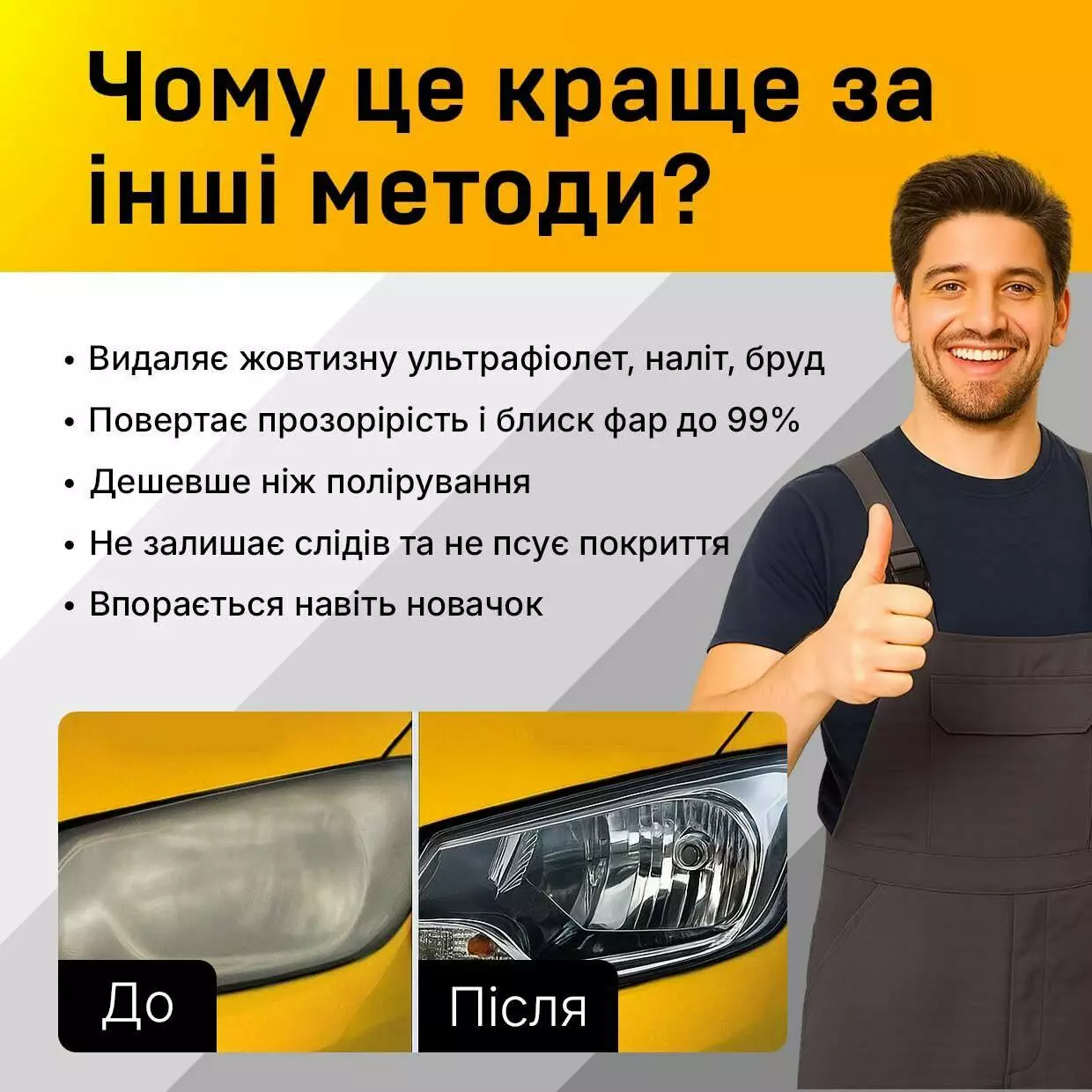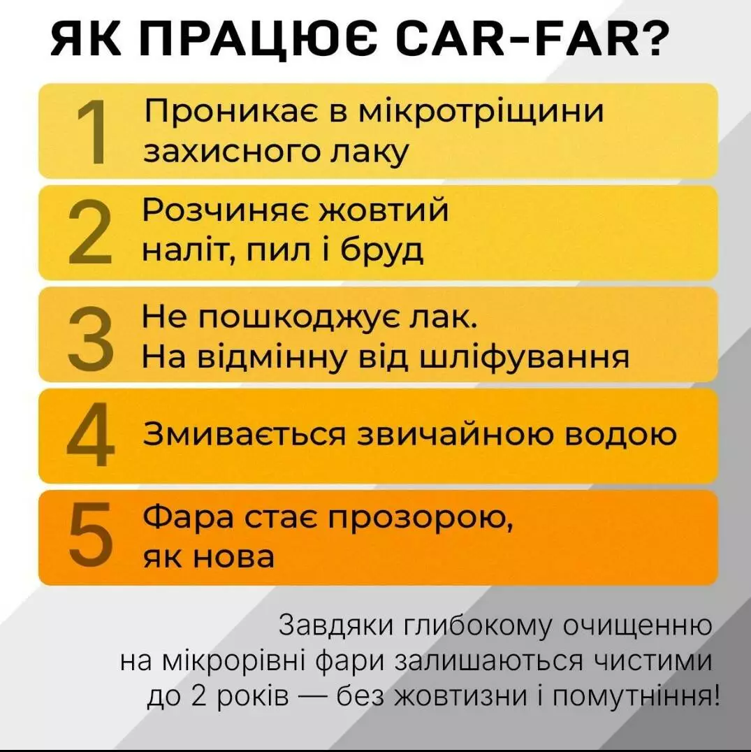 Очисник фар КАРФАР має унікальну формулу та принципово новий підхід до проблеми з помутнінням автомобільних фар. Ви зможете очистити поверхню фари від жовтого нальоту ультрафіолету та помутніння за 5 хвилин без додаткового обладнання і досвіду, не пошкоджуючи захисний лак та інші деталі кузова!
