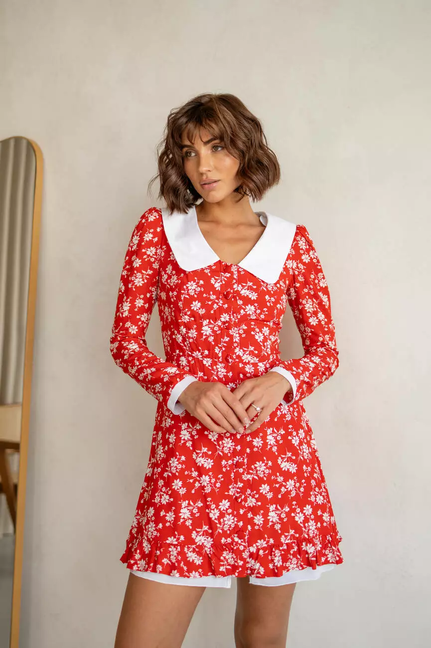 Чарівна сукня з красивим білим комірцем має приталений крій, який ідеально підкреслює фігуру та вільну спідницю, рукава з білими манжетами.