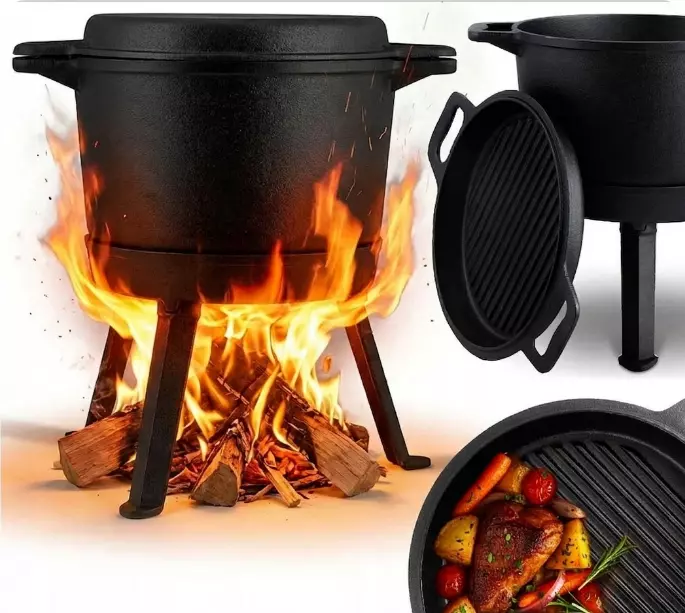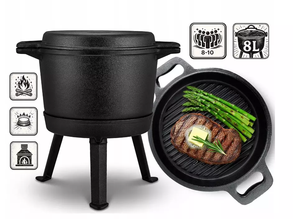 Чавунний казан із кришкою-сковородою 8 л для вогнища та гриля