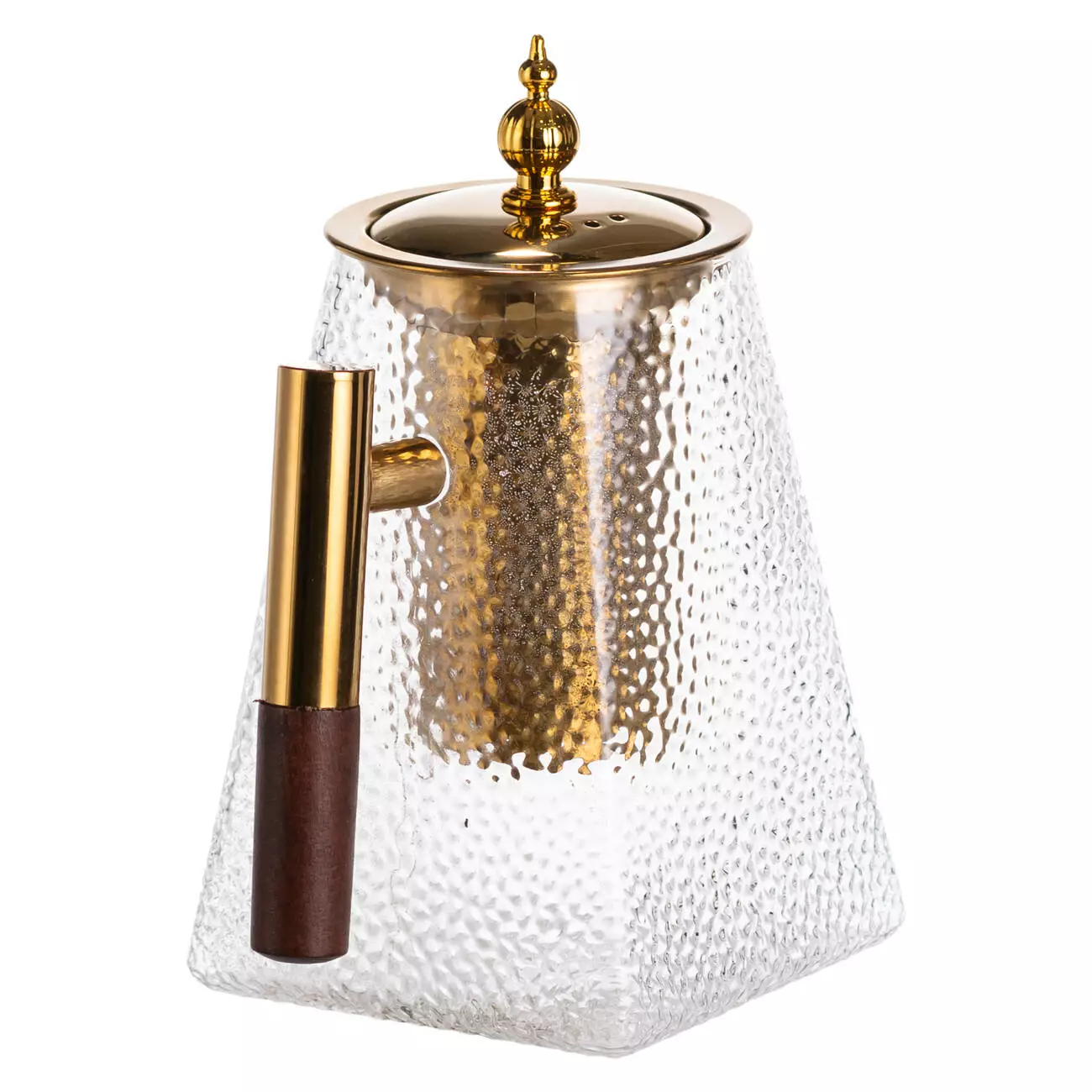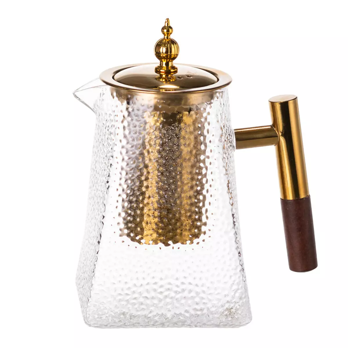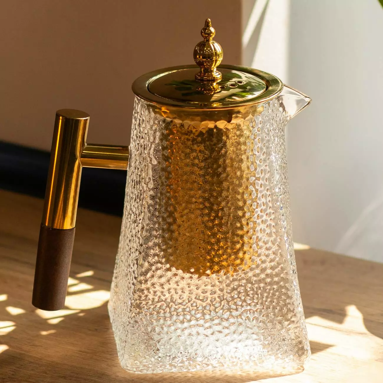 Цей заварювальний чайник стане акцентом чайної колекції та вишуканим елементом сервірування. Корпус виконаний із міцного термостійкого скла з виразною молоточковою текстурою, яка не лише надає виробу декоративного об'єму, а й гарно заломлює світло. Крім того, така поверхня набагато менш марка: вона ефективно приховує відбитки пальців та сліди від крапель, зберігаючи акуратний вигляд навіть за активного використання.