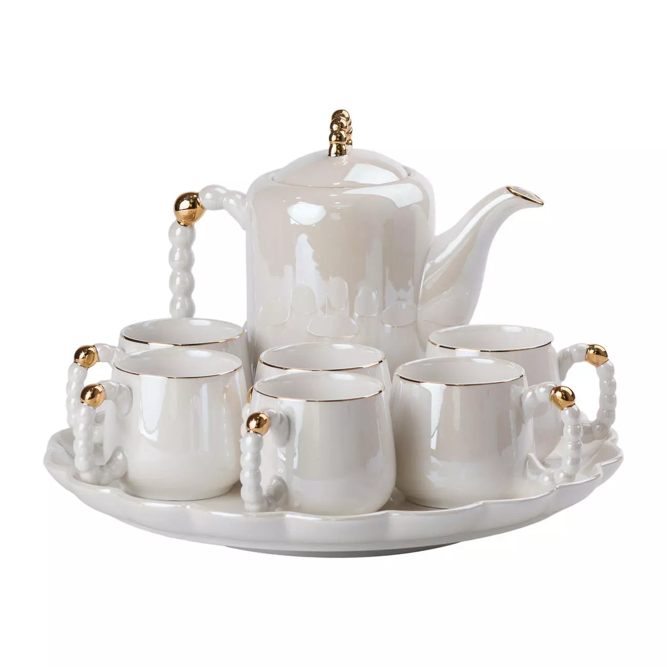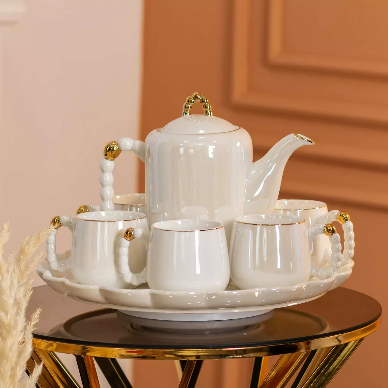 Чайний сервіз порцеляновий на 6 персон — це вишуканий набір із 8 предметів, ідеально підходить для стильного чаювання. Виготовлений із якісного порцеляни, сервіз має гладку, глазуровану поверхню, що надає йому блискучого та елегантного вигляду. Особливістю цього набору є ручки чашок і чайника, виконані у вигляді перлин, що додає витонченого шарму та розкоші. Чашки мають золотий обідок, який підкреслює вишуканість дизайну. У комплекті також є таця, що робить цей набір зручним і практичним для сервірування.