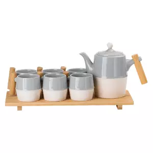 Чайний сервіз порцеляновий на бамбуковій підставці — це елегантний набір із 8 предметів, що поєднує стиль і функціональність. Сервіз виконаний у гармонійному поєднанні сірого та білого кольорів, що надає йому природної естетики та сучасного вигляду. До складу набору входить чайник об'ємом 1,3 л і шість чашок по 300 мл. Особливістю цього сервізу є бамбукові ручки на чайнику та чашках, які додають тепла та природного шарму, а також зручна бамбукова підставка для зберігання.
