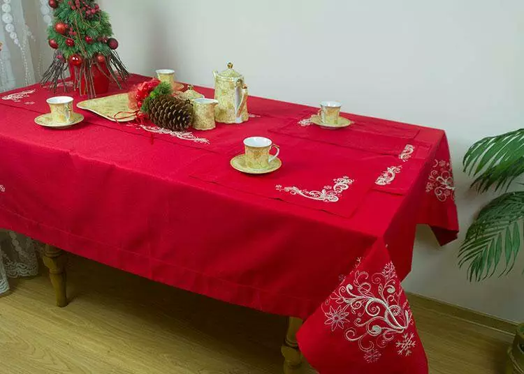 С такой новогодней скатертью сказочно-праздничное настроение гарантировано! Судите сами: красный, с белым вышитым орнаментом - будто сам Мороз нарисовал его для вас, украсив его своим эфемерным шлейфом.