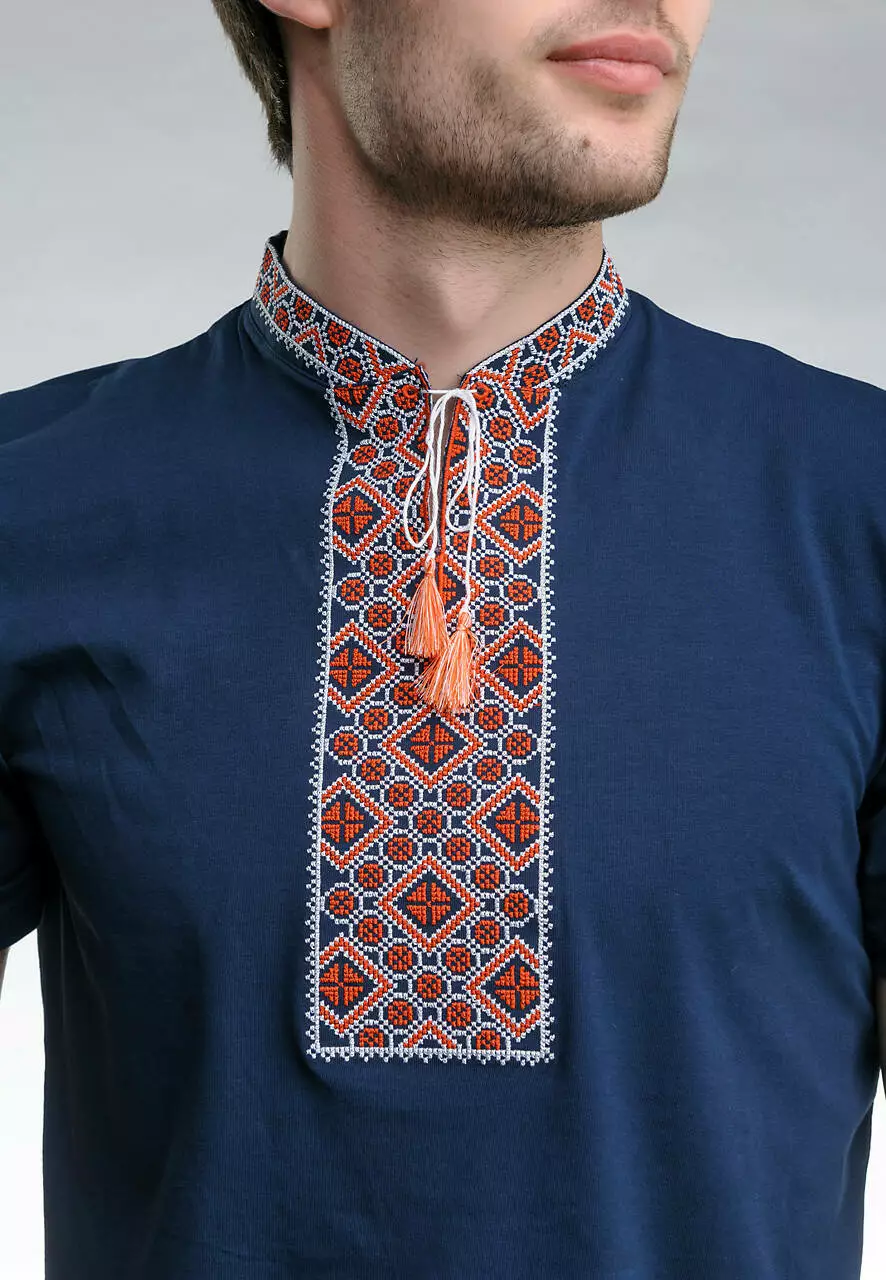 Річ вироблена із високоякісного матеріалу – бавовни. Для вишивки використовувалися елементи слов'янської вишивки. Реалізовувалася машинною технікою білими та кораловими нитками на тканині темно-синього кольору. Все для того, щоб ви отримали нашу футболку у найкращому вигляді.