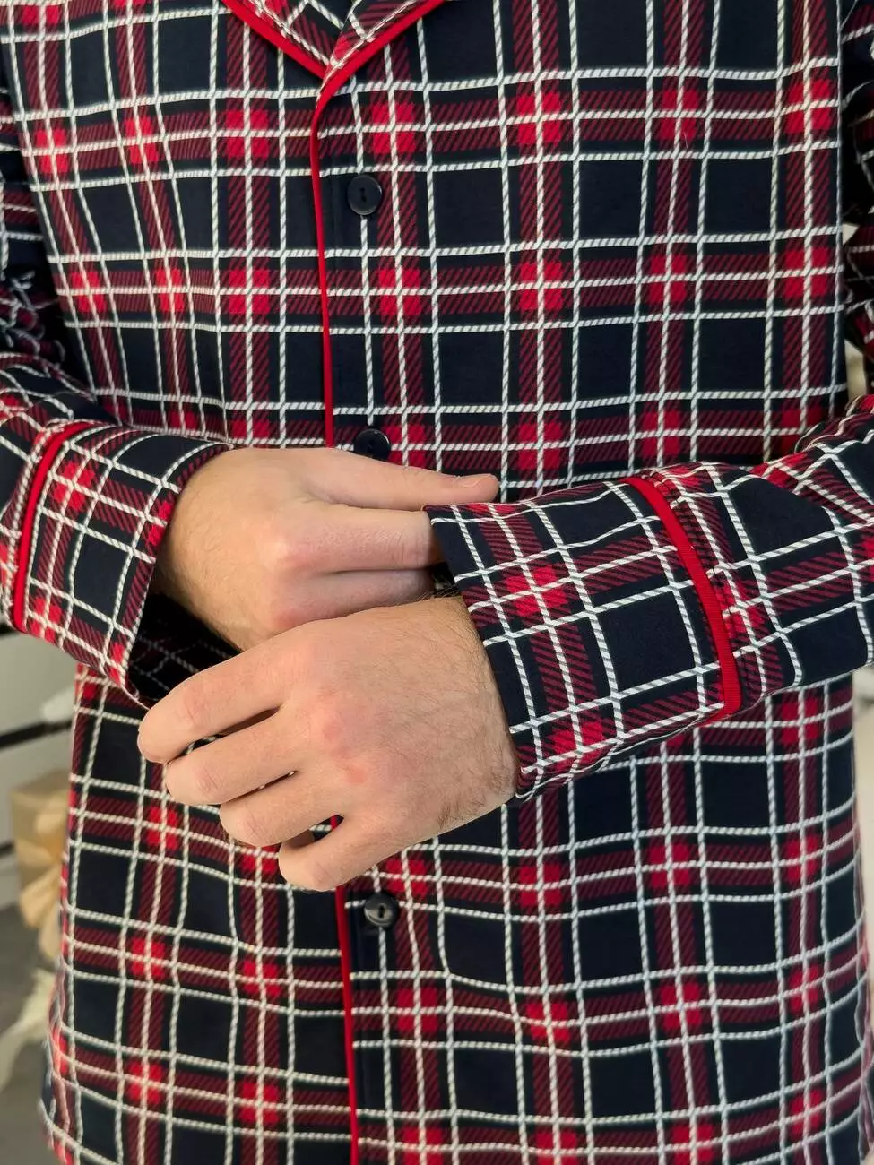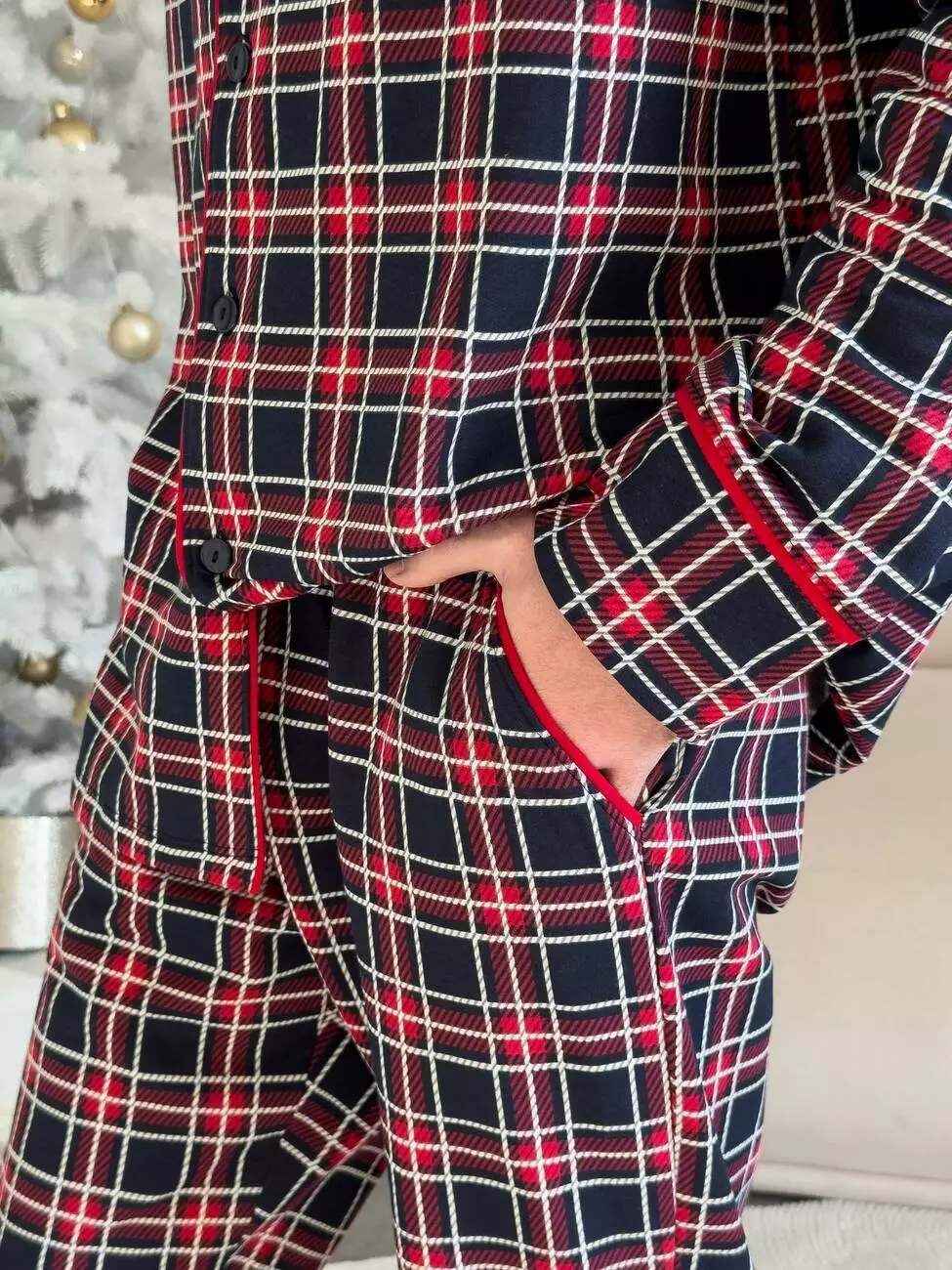 - Класичний принт у червоно-синю клітинку з елегантною контрастною окантовкою червоного кольору;