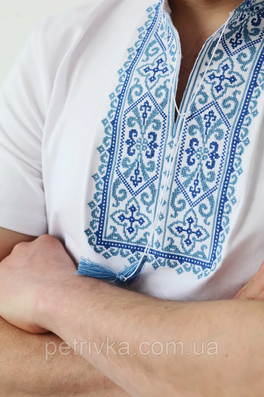Біла футболка з коротким рукавом, машинна вишивка хрестиком