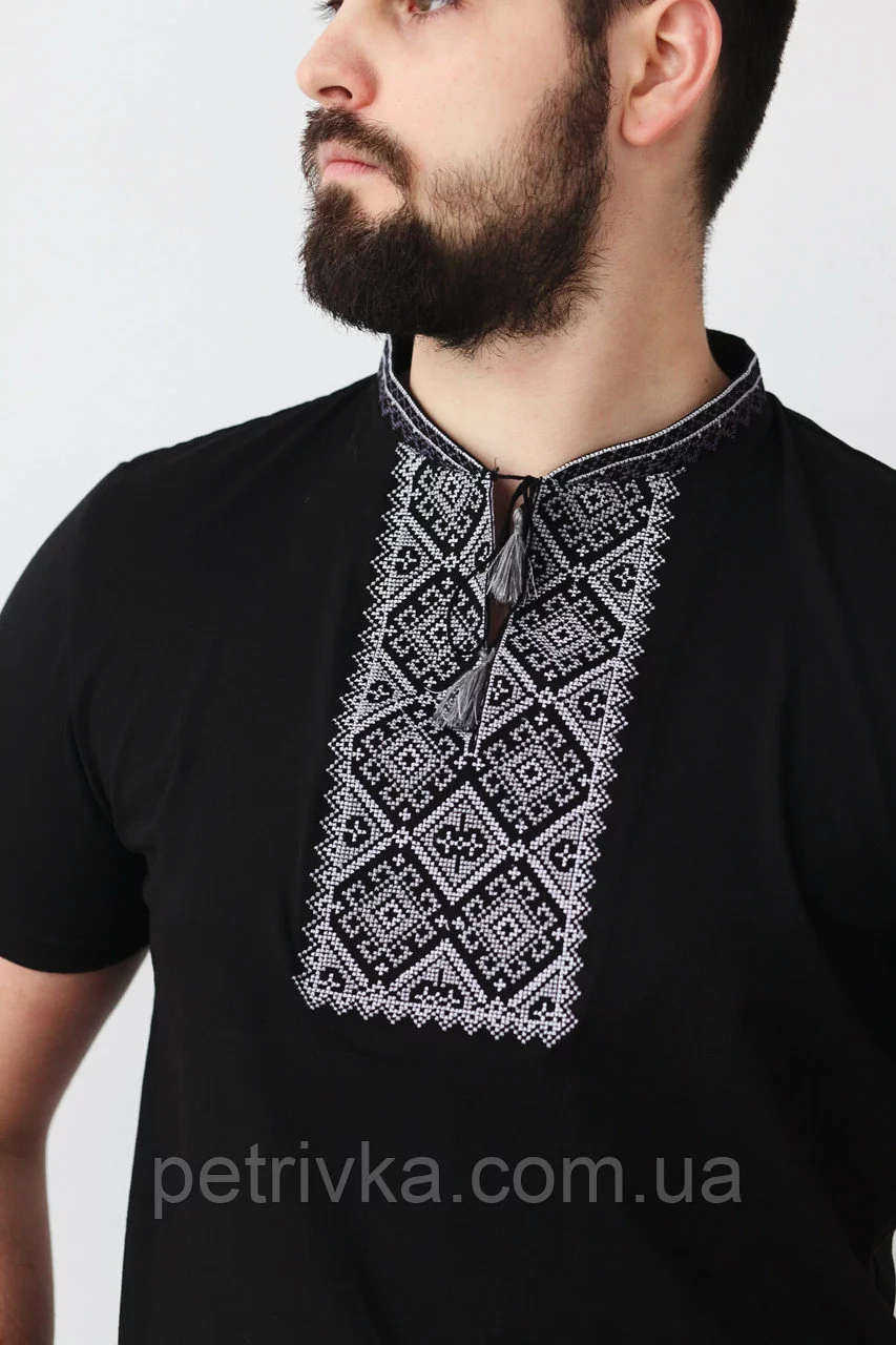 Чорна футболка з коротким рукавом, машинна вишивка хрестиком